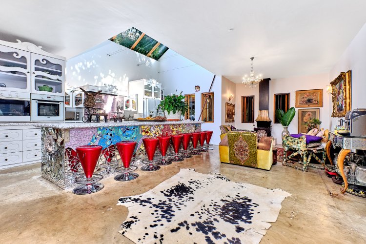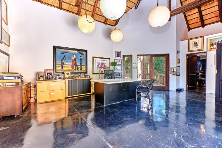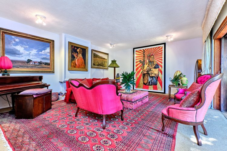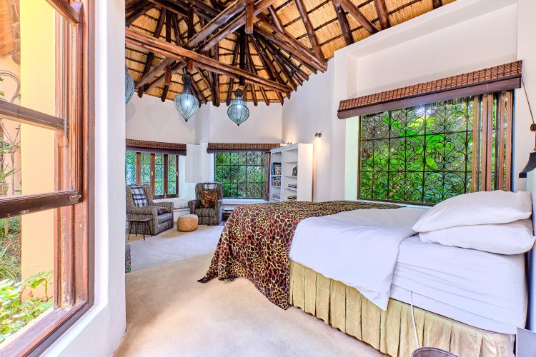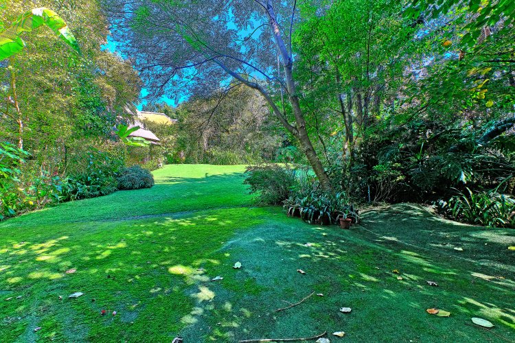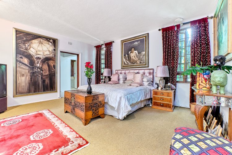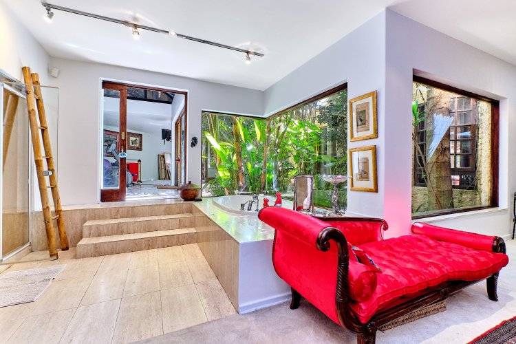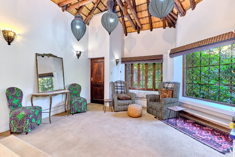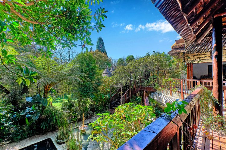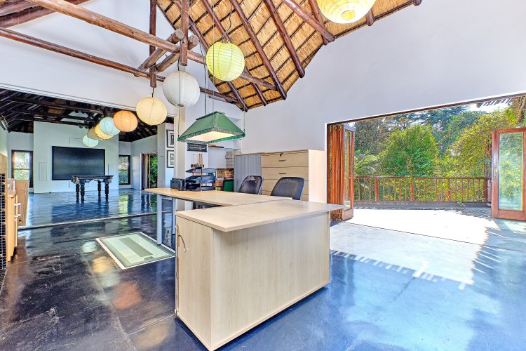 Unique in its presentation, this beautiful hideaway home in the heart of Sandton on 3500 sql, provides a surreal lifestyle experience for a family who want to live and not just exist ! This home offers a delightful eclectic mix of styles and colour throughout the living spaces comprising lounge, dining room and family chill room. There is a feeling of a private Retreat in this spectacular garden with full borehole support , super lush grounds and majestic trees creating peace and tranquility . The large family pool and covered patio are surrounded by green foliage with colourful plants and paving creating a relaxed zen type ambience. The inviting French kitchen offers an eat-in area, gas cooker and wood burning fireplace, as well as Al Fresco setting on the wooden deck, stack back doors, and centre island and a seperate laundry section. On the upper level you will find an enormous games room plus sizeable home office / versatile as 5th bedroom with its own shower and kitchenette. The walk out patio deck has lovely views over the treed garden. Total under roof area is 1200 m2.