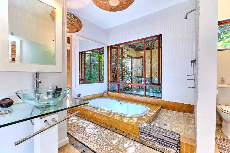 The primary bedroom (with fireplace ) has a super spacious ensuite with access onto the garden. In addition a steam room and gym area with built in jacuzzi . The 3 family bedrooms are all ensuite with pyjama lounge, built in cupboards and garden views.