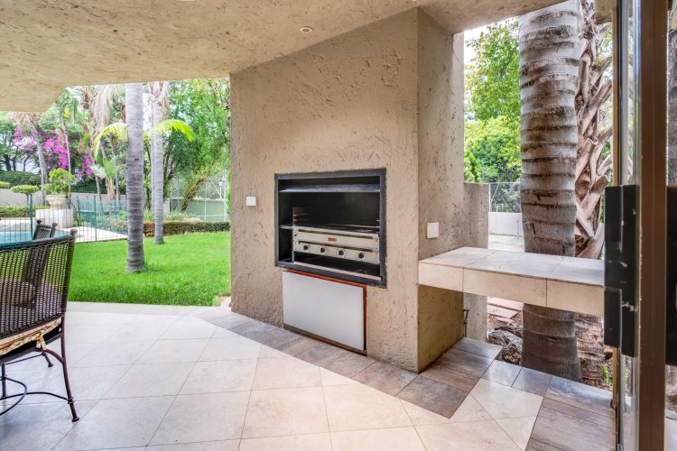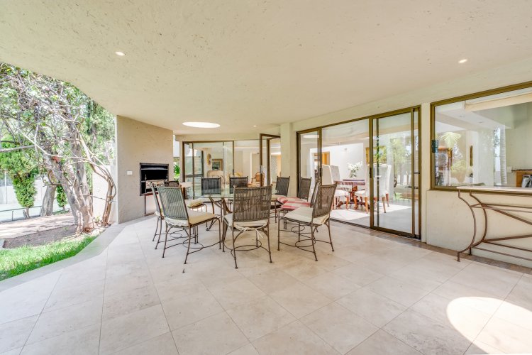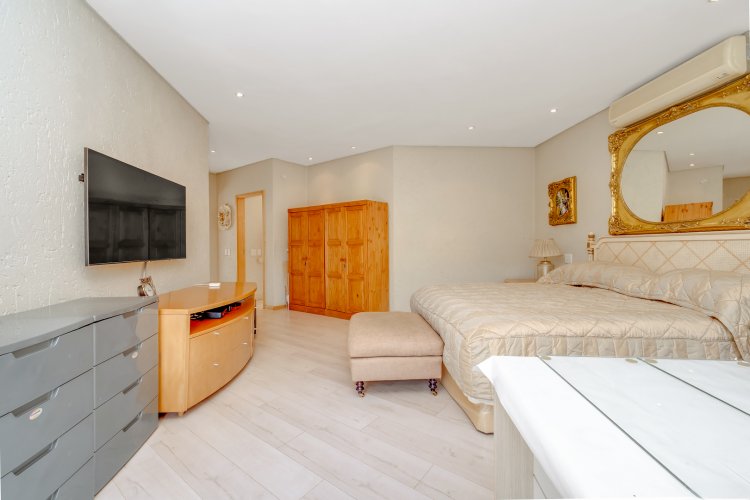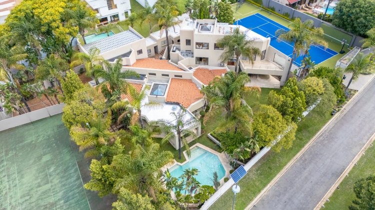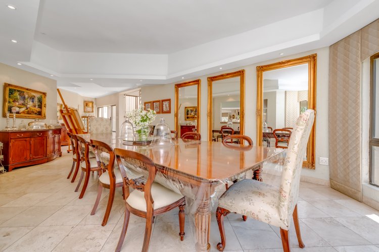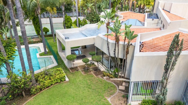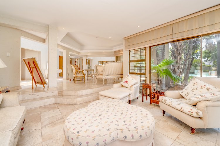 A tranquil sunlit entrance greets you. Quality travertine tiled floors highlight the natural rays streaming in through feature skylights and well appointed atriums. Elegant receptions set the tone for relaxation and easy entertaining. A spacious chill lounge, a family room with built-in bar, and a sizeable dining room, all open up onto the lavish covered patio with built in gas braai. The blue Summer pool set in a lush lawned garden provides peace and privacy. There is a tennis court ( in need of repair or repurposing )