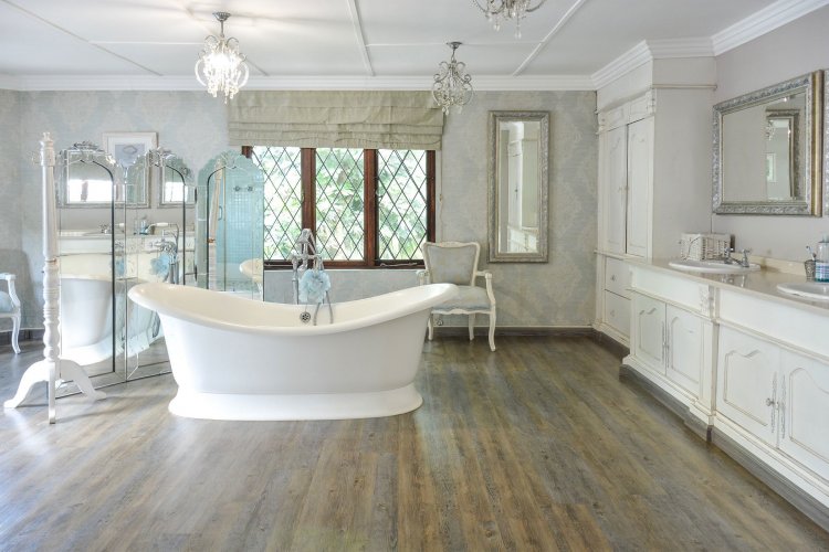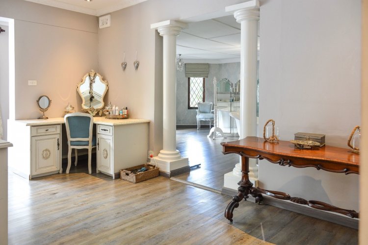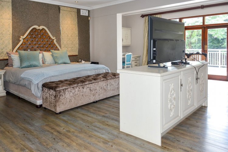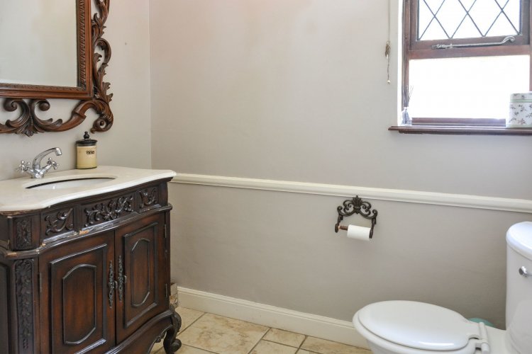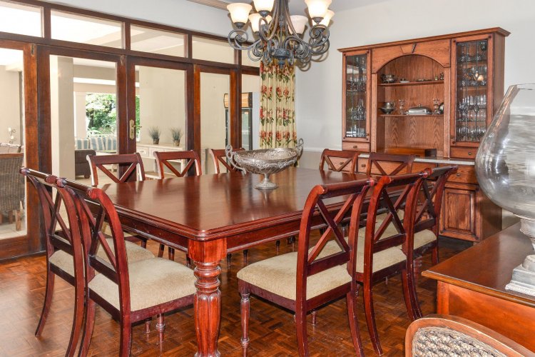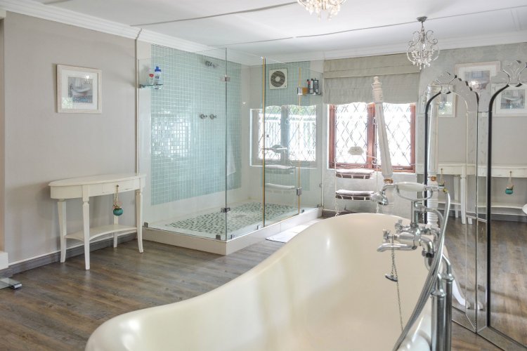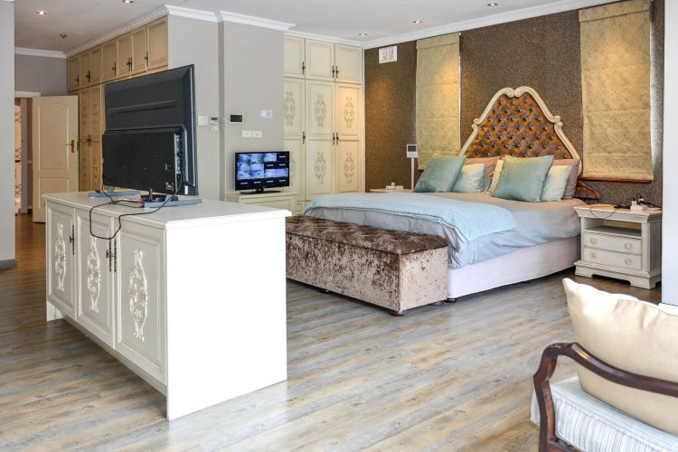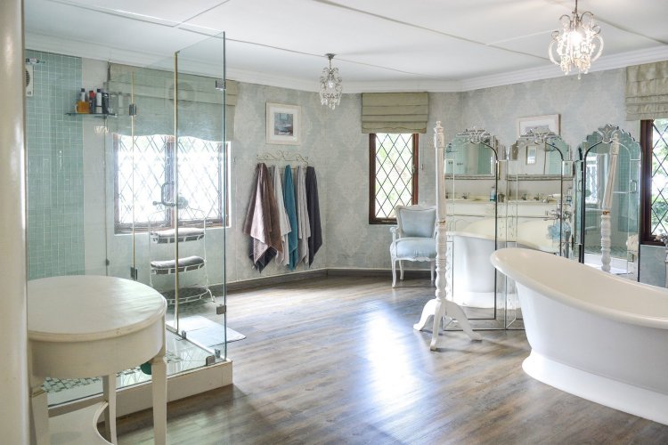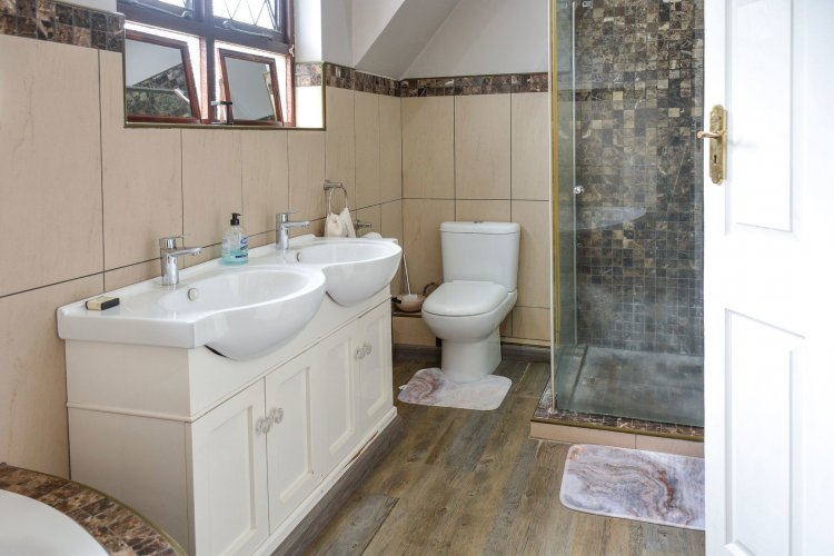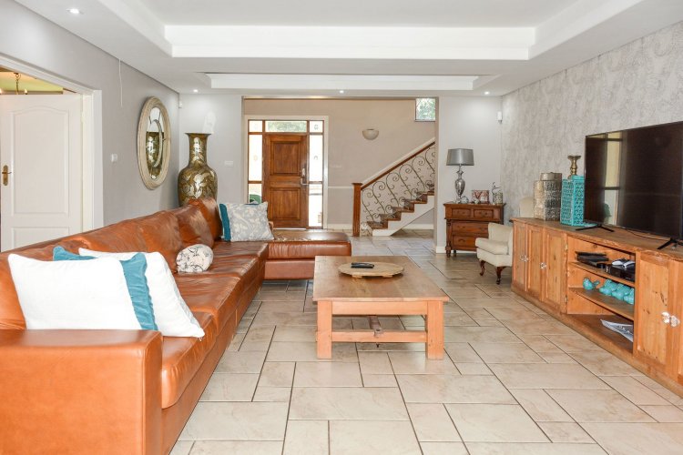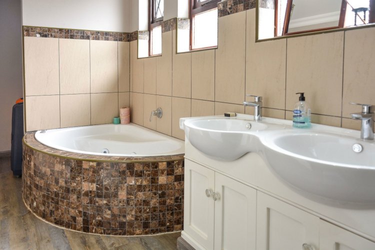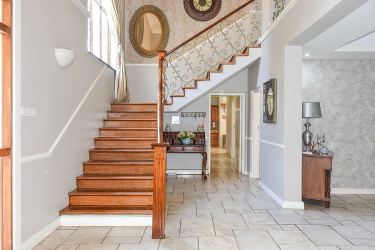 The main double storey home has a classic look with lead-detailed windows and generous living spaces. Downstairs includes two lounges and a formal dining room. A chef's dream kitchen with a large central workspace, pantry, and scullery. A home office suite complete with kitchenette and private bathroom. Ideal for working from home or as a home gym. 5 bedrooms upstairs (two en-suite), plus a family bathroom with a guest toilet downstairs. The master bedroom includes a walk-through dressing area, walk-in closet, private balcony, and a luxurious ‘wow factor' en-suite bathroom.