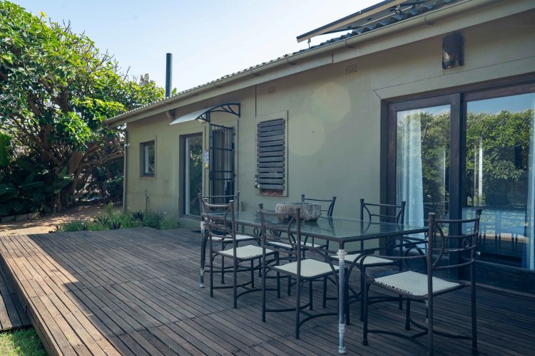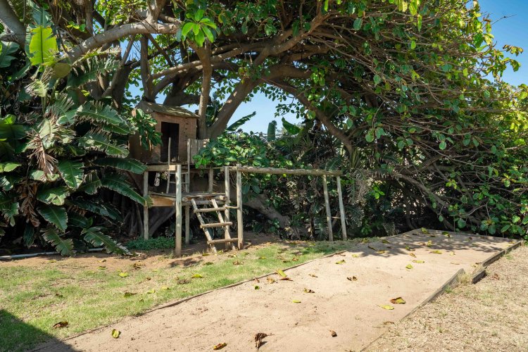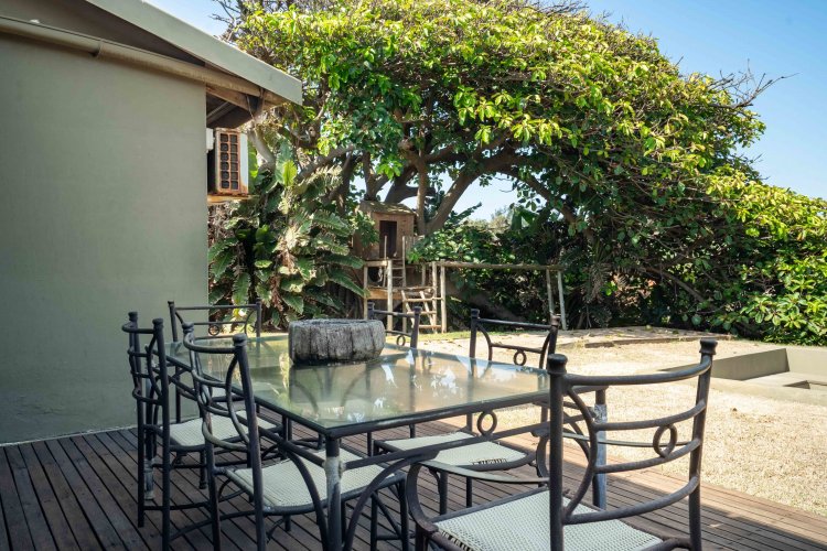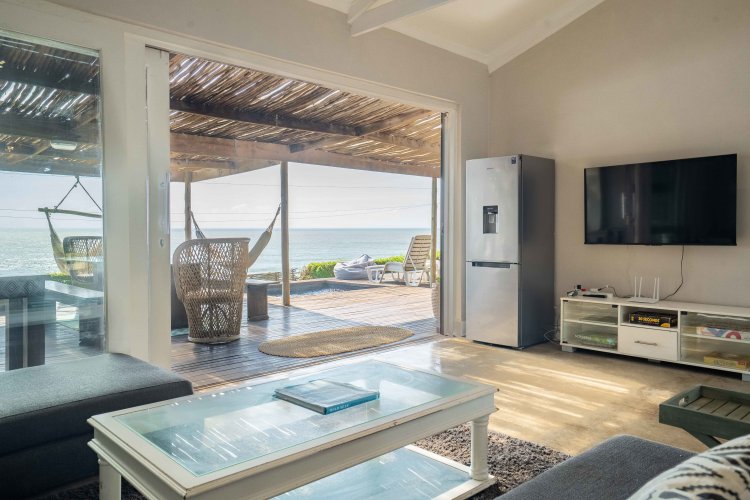 The well-designed open-plan living area flows into a modern kitchen with gas stove, Caesarstone countertops, and a central island with bar seating — perfect for relaxed entertaining. Outdoor living takes centre stage with an enclosed braai area, sparkling pool, and tranquil spaces to watch dolphins, whales, the sardine run, and abundant birdlife. A second patio with dining space, fire pit, and jungle gym completes this family-friendly haven.