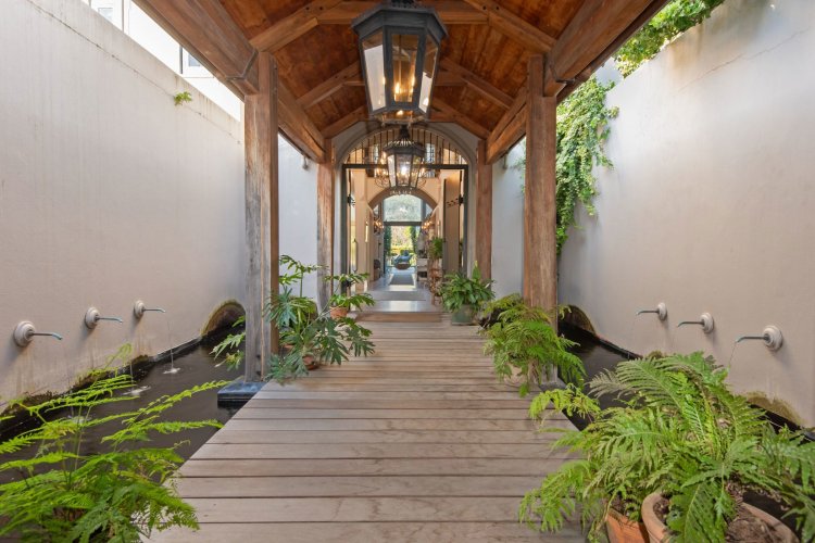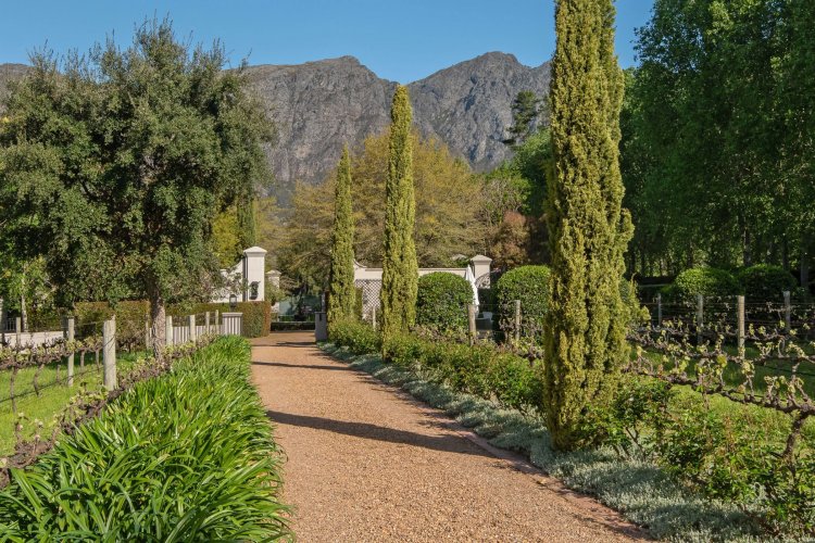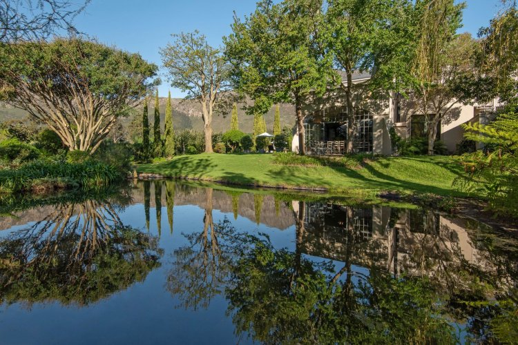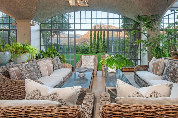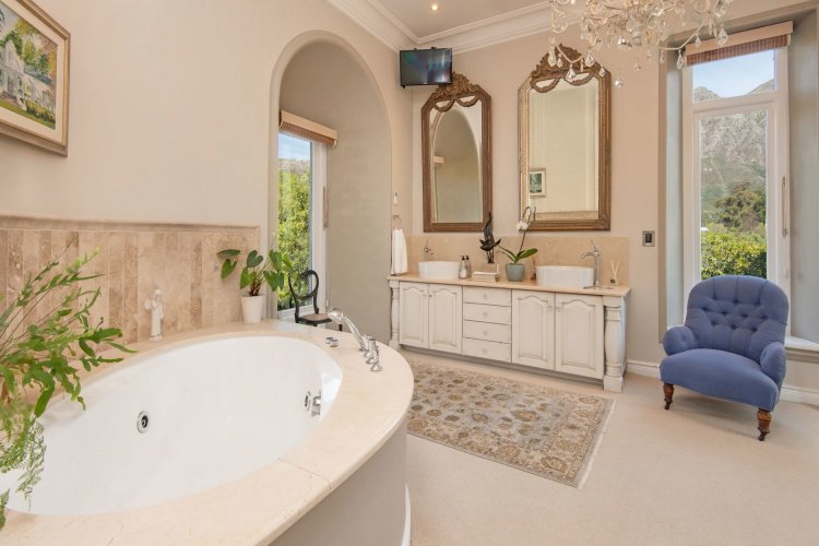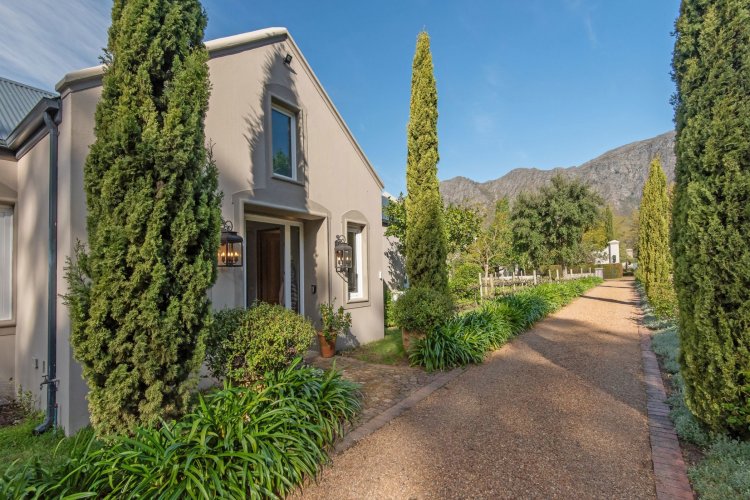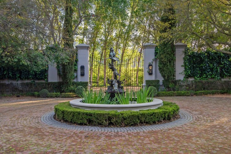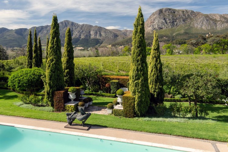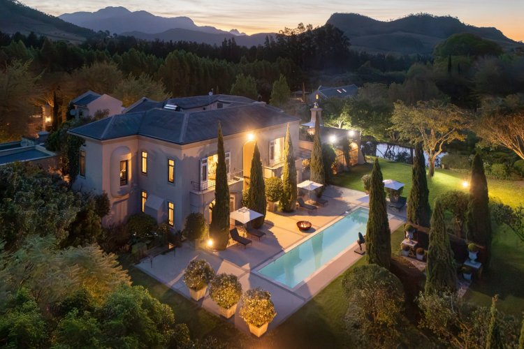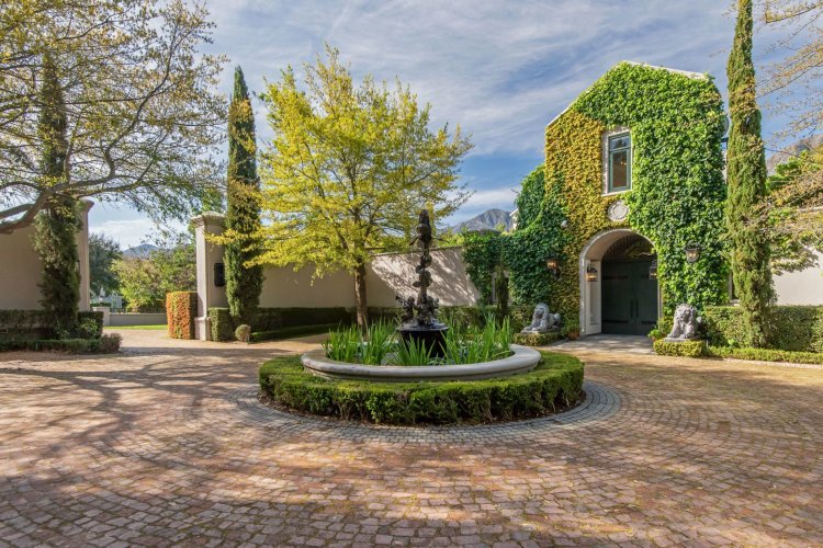 Set in the quietest corner of the Franschhoek valley, just two kilometres from the village centre, Sandstone House commands attention from the moment you arrive. The paved courtyard, anchored by a sculptural fountain and flanked by stone lions, leads to an ivy-covered façade. The central gabled entrance rises like a pavilion, all classical curves and considered details. This is a residence that understands the power of first impressions.