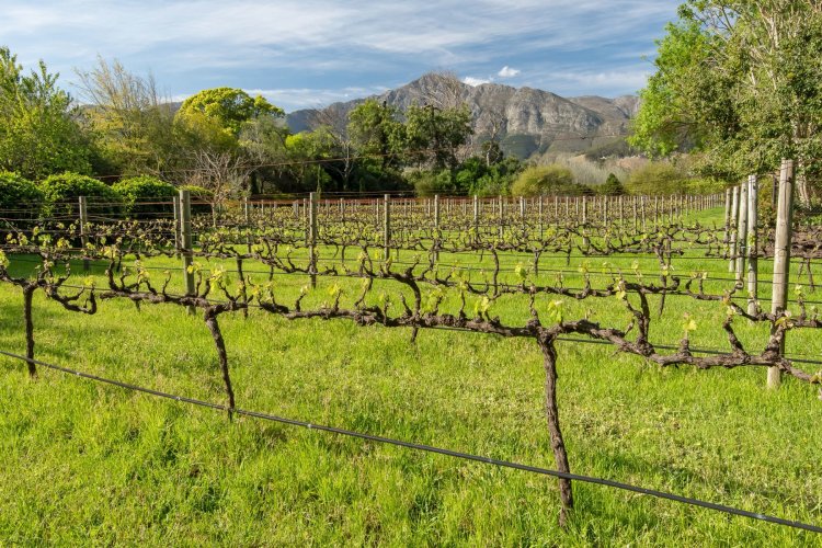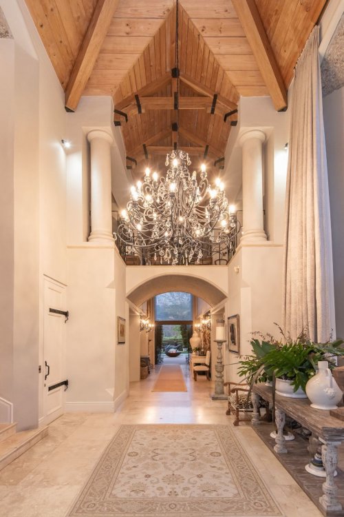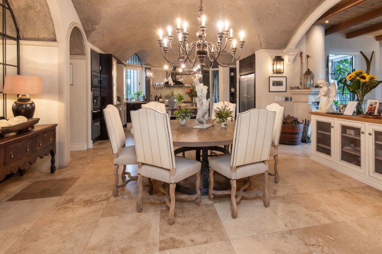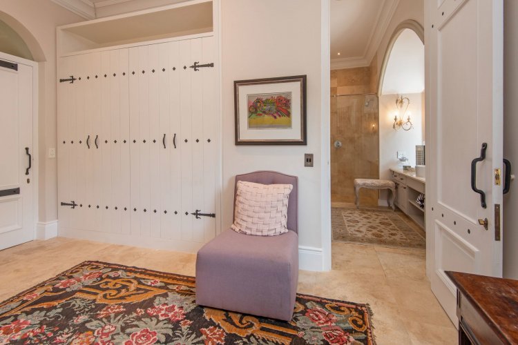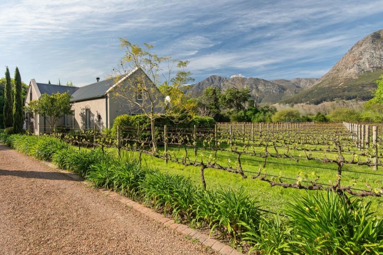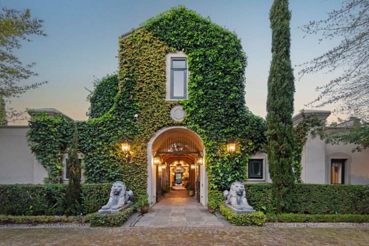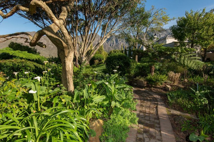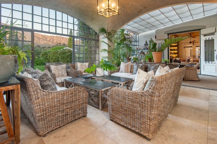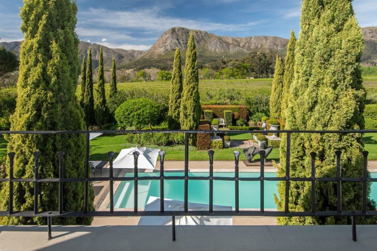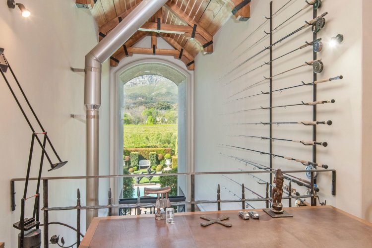 Set in the quietest corner of the Franschhoek valley, just two kilometres from the village centre, Sandstone House commands attention from the moment you arrive. The paved courtyard, anchored by a sculptural fountain and flanked by stone lions, leads to an ivy-covered façade. The central gabled entrance rises like a pavilion, all classical curves and considered details. This is a residence that understands the power of first impressions.