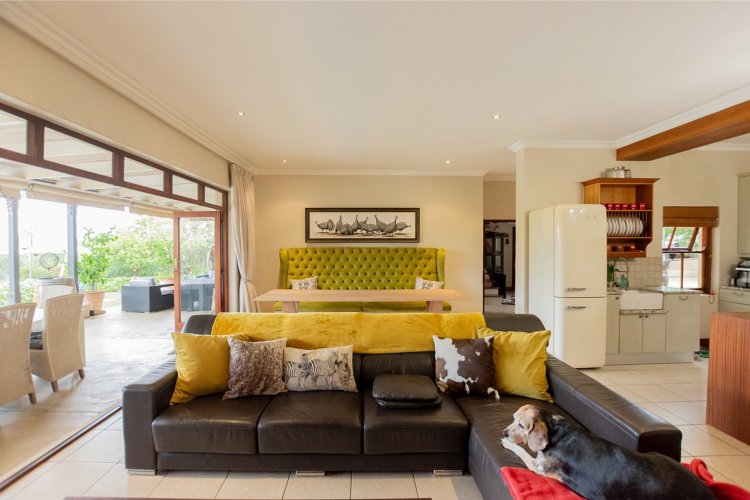 The expansive open-plan kitchen, dining, and living area is perfectly suited for both intimate family living and large-scale entertaining. A striking central island with granite countertops anchors the kitchen, complemented by a separate scullery and a discreet passage providing secure access to the double garage. The living room is warmed by an elegant fireplace, creating an inviting atmosphere during cooler months.