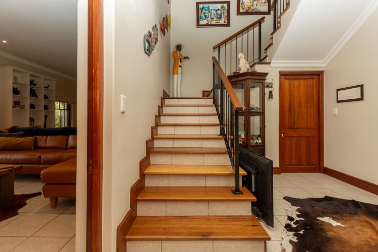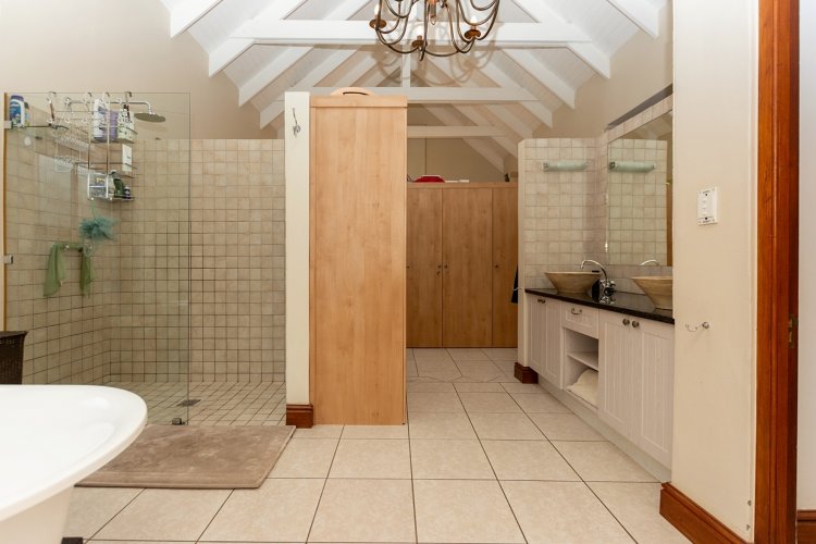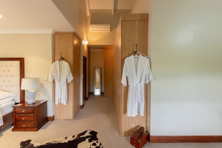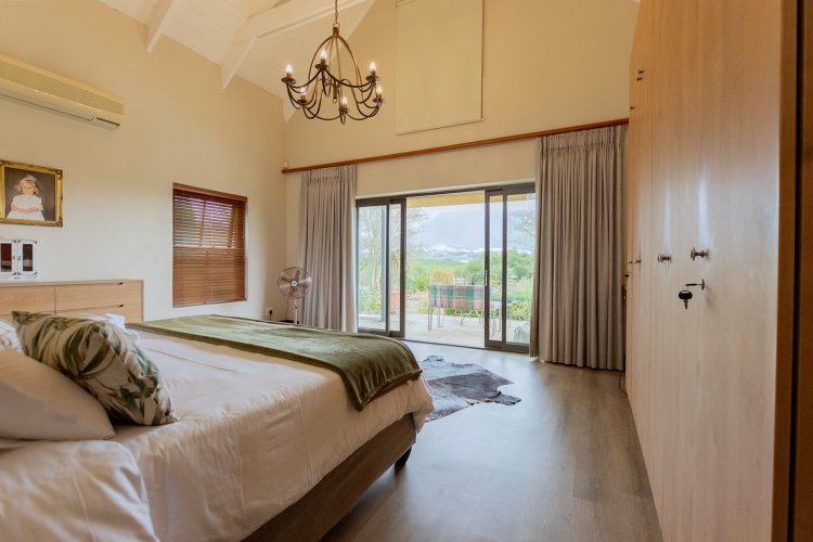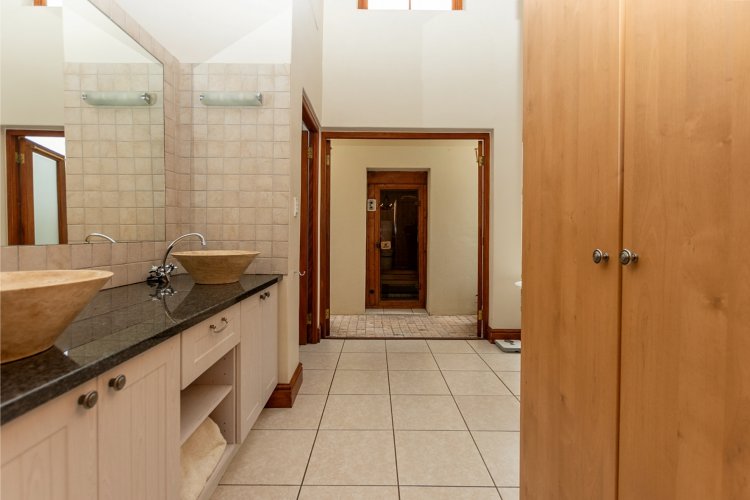 The main residence has been thoughtfully designed to combine luxury with functionality. The master suite is a private sanctuary, featuring sliding doors that open onto a patio with panoramic views. Generous cupboard space complements the exquisite en-suite bathroom, which extends into a tranquil private atrium accompanied by the soothing sound of running water. A sauna adds an indulgent touch, while a dedicated office space within the suite offers convenience for work-from-home living.
