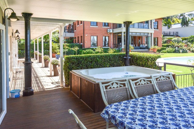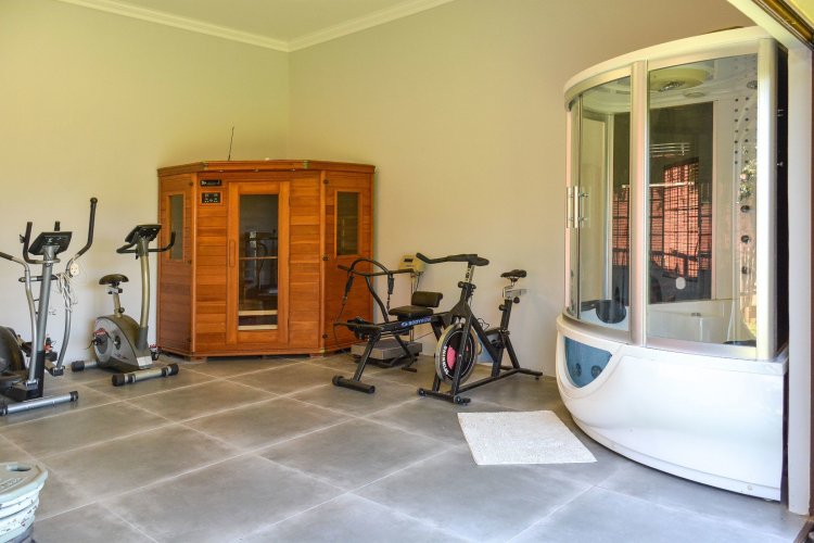 The separate entertainment area is modern and spacious with open plan living area, fitted kitchen and bathroom. The large masterpiece wooden fitted bar has all the necessities. This leads out to the deck with Jacuzzi and then to the sparkling swimming pool. The change room could be staff accommodation and there is a separate gym with sauna and steam bath.
