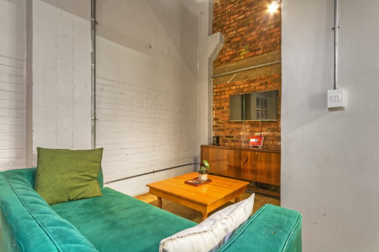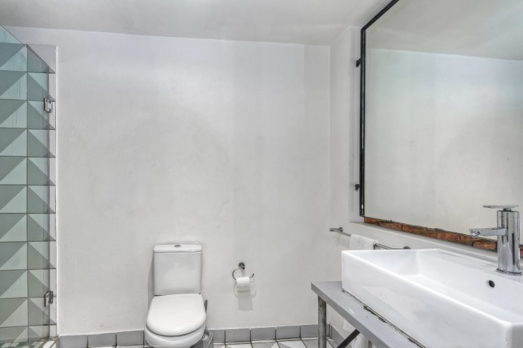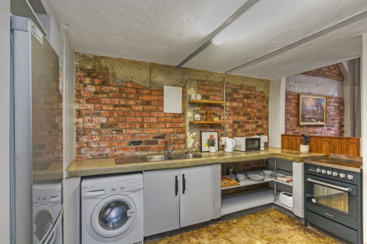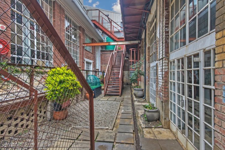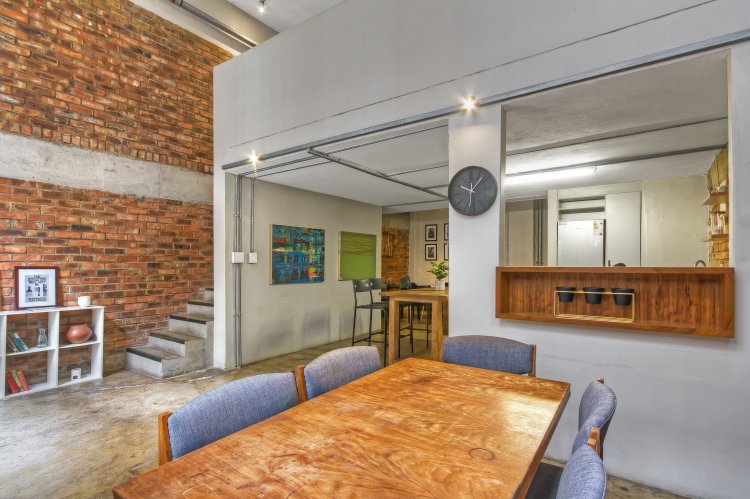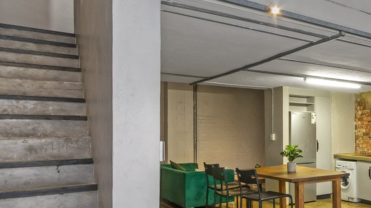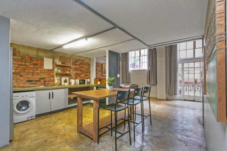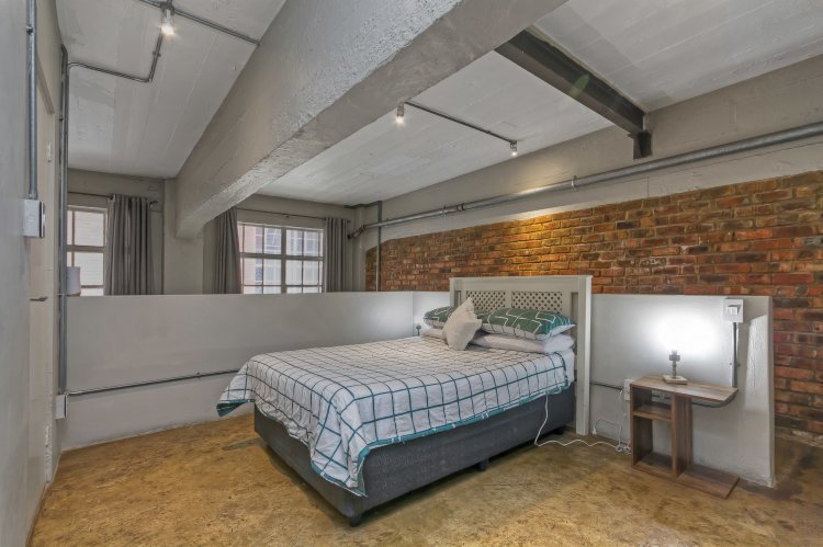 Situated in the heart of the Maboneng Precinct, this 82 sqm ground-floor duplex loft combines generous space with a bold industrial aesthetic. Double-volume ceilings, expansive steel-framed windows, and exposed brick walls create an impressive atmosphere, while the open-plan layout allows for a natural flow between the living, dining, and kitchen areas. The kitchen features concrete countertops and practical finishes that complement the building’s character.