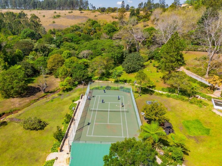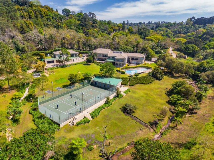 A second, similarly styled building offers three modest guest bedrooms with stunning views over the estate from its elevated position, along with a double garage-sized laundry underneath.