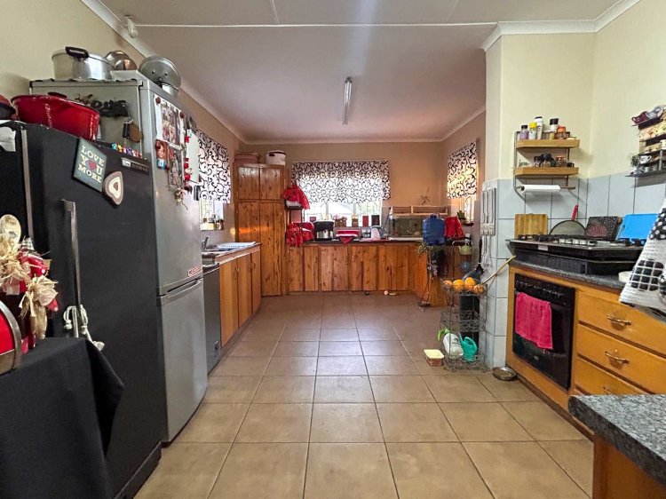 The open plan kitchen is both functional and welcoming, featuring ample cupboard space, generous countertops, and a separate scullery — making meal preparation a joy. The living and dining areas flow effortlessly to a private patio and garden, creating a lovely space to entertain or simply unwind outdoors.