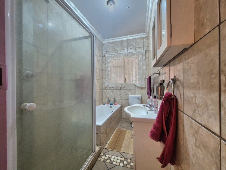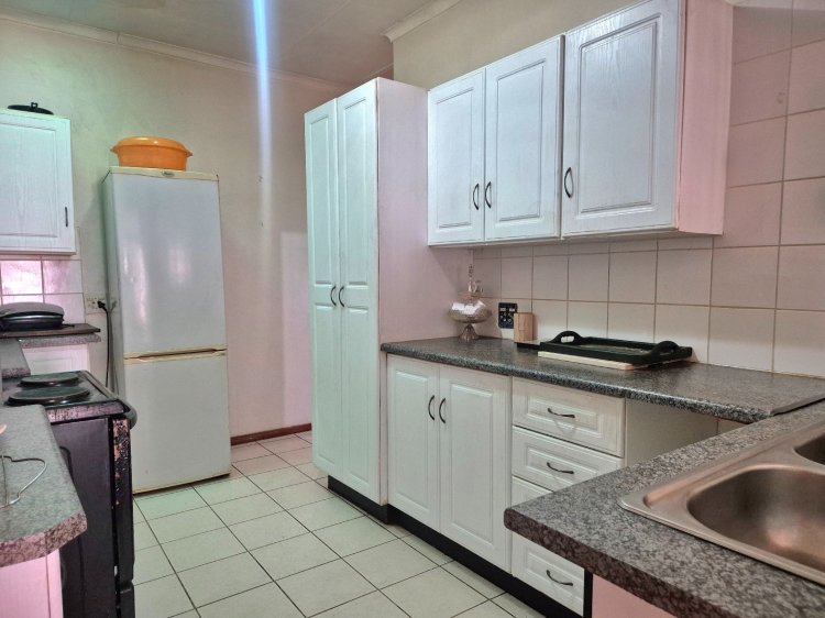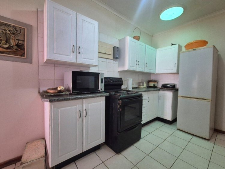 Die tweede slaapkamer, geleë links van die kort gang wat uit die sitkamer lei, is ook ruim genoeg vir ‘n dubbelbed of selfs groter, met bykomende meubels soos ‘n spieëlkas en bedkassies. Albei kamers het meer as genoeg kaste. Die ligte, netjiese badkamer is toegerus met ‘n bad, stort, wasbak en toilet – alles wat jy nodig het vir gerief en funksionaliteit. Aan die einde van die gang vind jy die kombuis, kompak maar prakties uitgelê, met ligte kaste wat die ruimte oop en vars laat aanvoel.