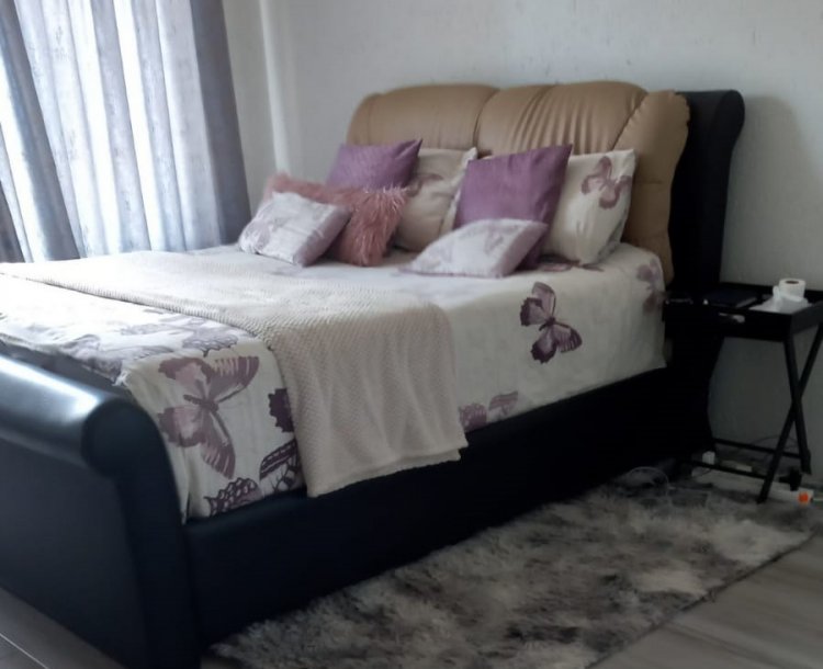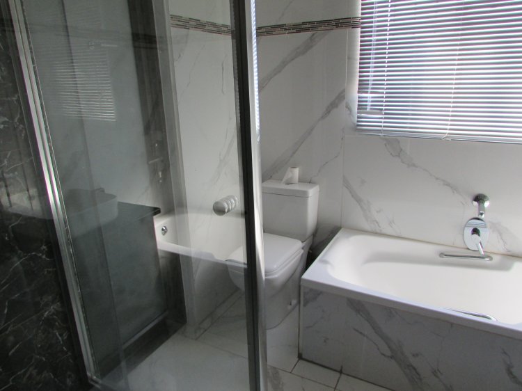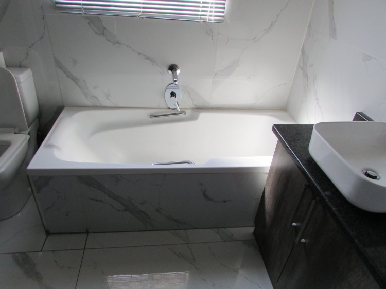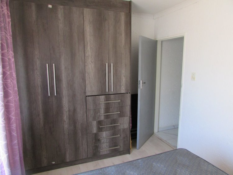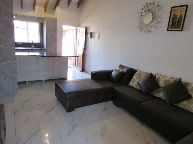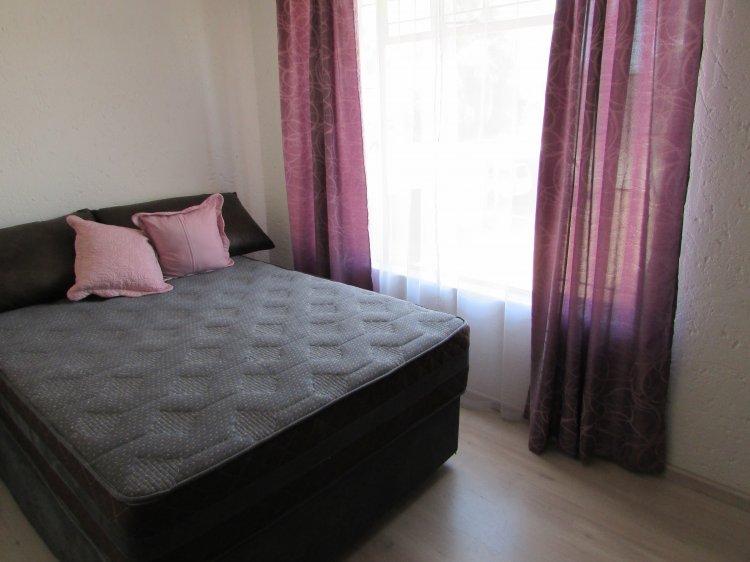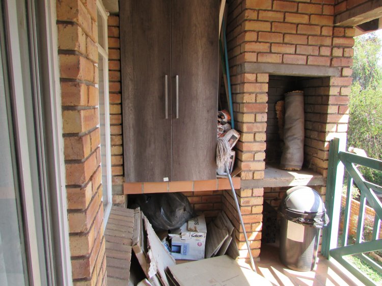 Consist of an open plan reception area neatly tiled, leading to a balcony with build in braai and a lovely view over the garden area. A well sized kitchen with packing space, breakfast nook, hob, under counter oven and granite tops. 2 Spacious bedrooms with build in cupboards and laminated floors. 1 Full bathroom with shower, bath, basin and toilet.