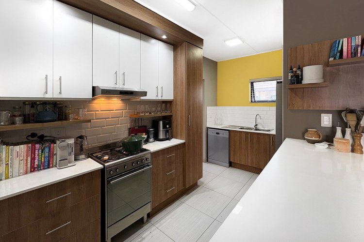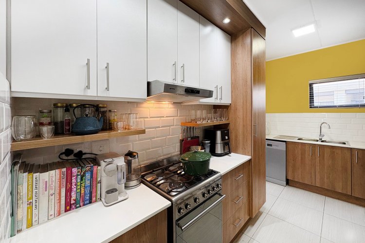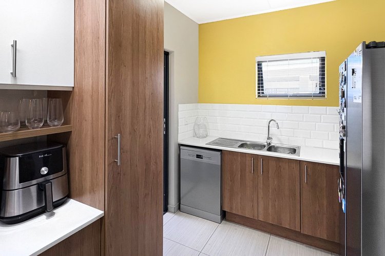 The kitchen is fully equipped with high-quality Smeg appliances, including an extractor fan and gas stove, ensuring convenience during load shedding. It offers ample space for a double-door fridge, plumbing points for a dishwasher or washing machine, a double sink, and a thoughtfully designed scullery nook, which provides additional space for laundry or even a protected vegetable garden.
