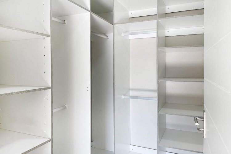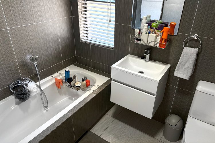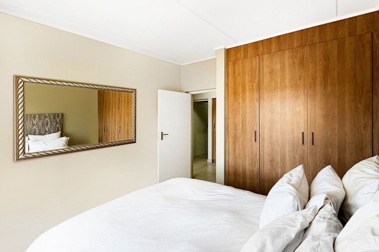 The main bedroom is a standout feature, complete with a walk-in wardrobe and an en-suite bathroom equipped with both a shower and a built-in bath. The other two bedrooms also include built-in cupboards, allowing for plenty of storage, and are flooded with natural light, offering picturesque views of the blue sky.