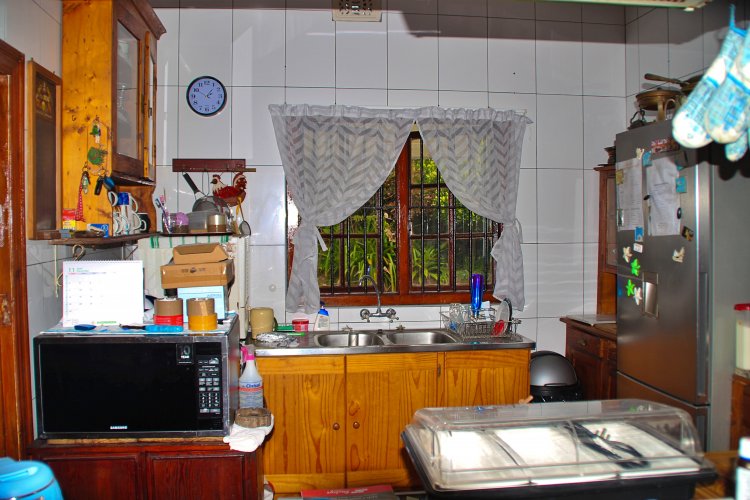 From the moment you arrive, you’ll be greeted by a neat, white-painted exterior accented with decorative awnings and secure gates, giving the home both charm and peace of mind. The lush garden and mature trees create a tranquil setting, while the spacious paved driveway and carport ensure plenty of parking for family and guests. The home offers three comfortable bedrooms and two and a half bathrooms, providing plenty of room for the whole family. The bright lounge and dedicated dining area feature low-maintenance tiled flooring, creating a warm and practical living space. The rustic kitchen boasts charming wooden cabinetry, tiled walls, and a freestanding oven. A convenient pass-through window connects the kitchen to the living area, perfect for family interaction or entertaining.