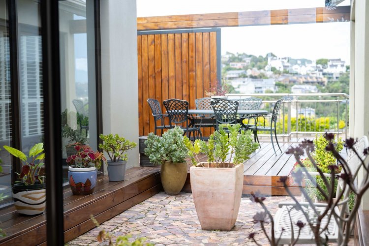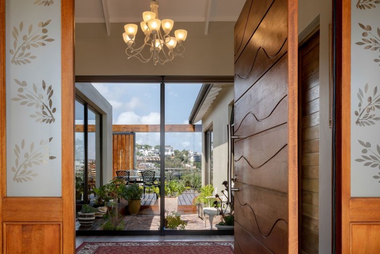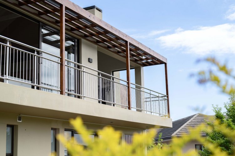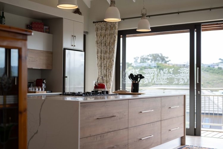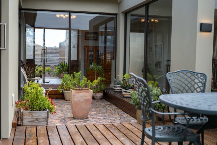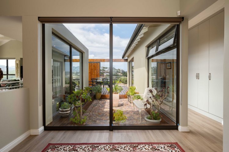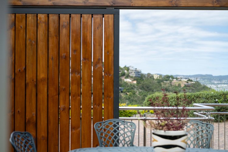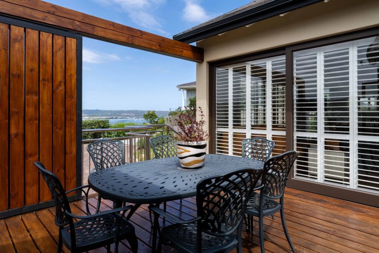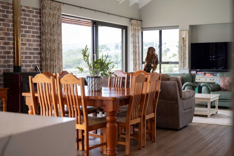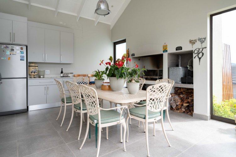 Sliding doors open onto a sheltered patio with adjustable panels, allowing you to enjoy the views while protected from the wind. The indoor-outdoor braai makes entertaining relaxed and effortless throughout the seasons.