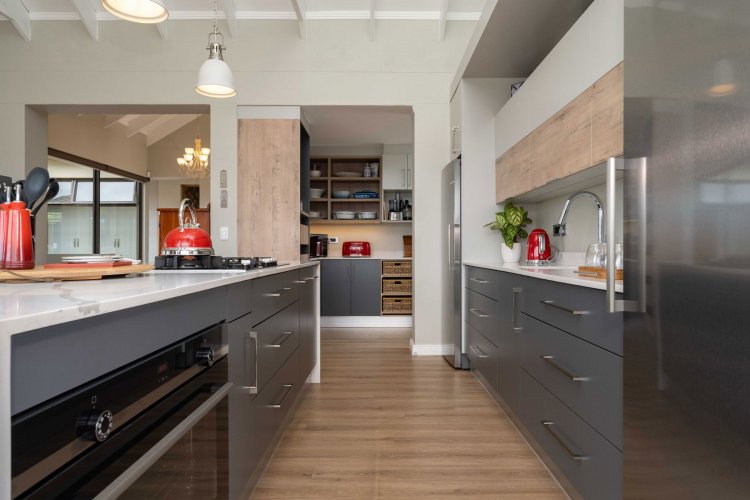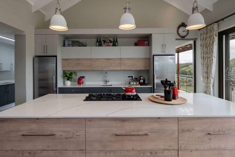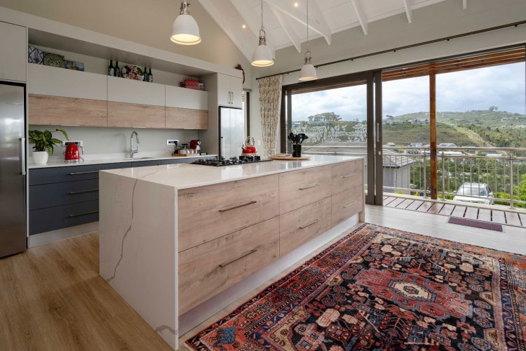 The upper level welcomes you with volume and natural light. Exposed trusses and large windows frame the outlook, while the open-plan kitchen, dining and lounge with fire place flow comfortably together to create an easy, connected living space. The kitchen is well considered, with a generous central island, quality finishes and ample storage. A separate scullery provides built-in cupboards, space for appliances, a double sink and access to a practical outdoor utility area.