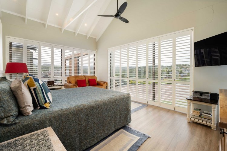 The main bedroom suite is positioned on this level for convenience and privacy. High ceilings enhance the sense of space, while air-conditioning, a ceiling fan, American shutters and double-glazed windows ensure comfort year-round. A walk-in cupboard leads to an en-suite bathroom with bath, shower and double vanity. A guest loo and direct access from the double garage adds to the home's thoughtful layout.