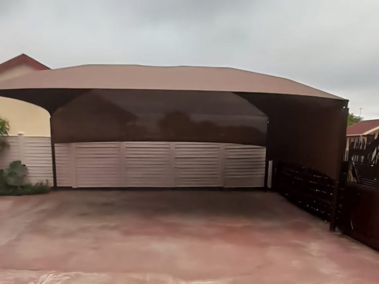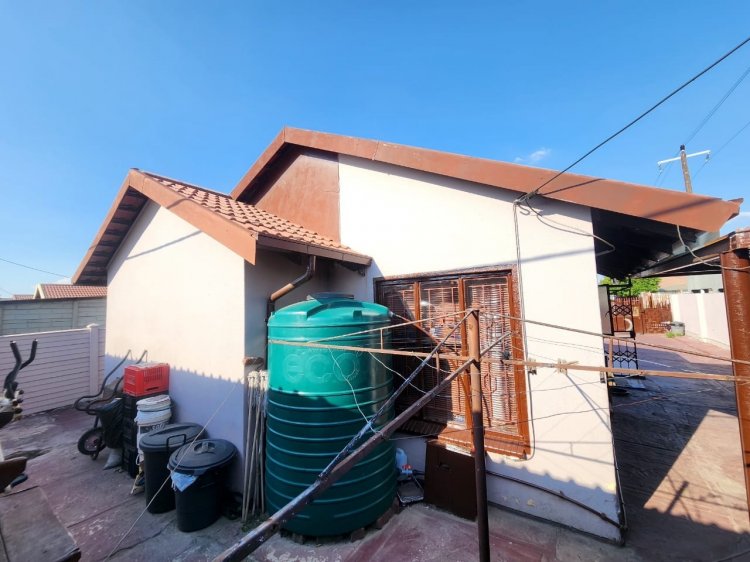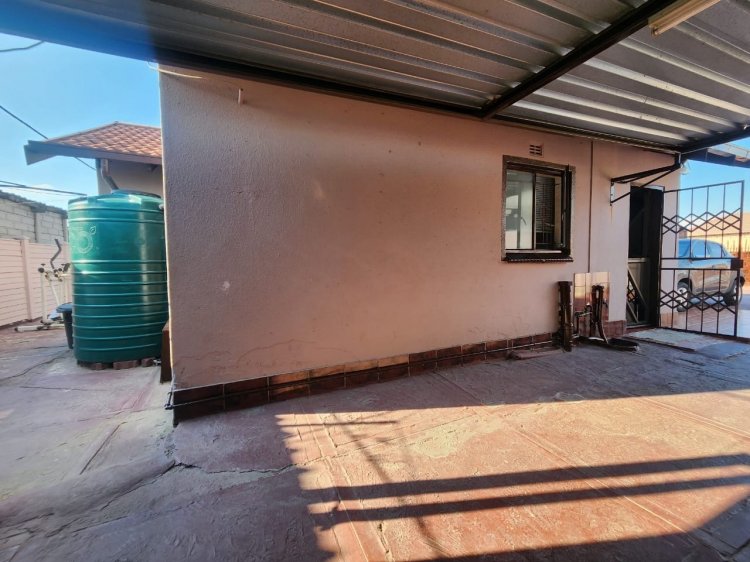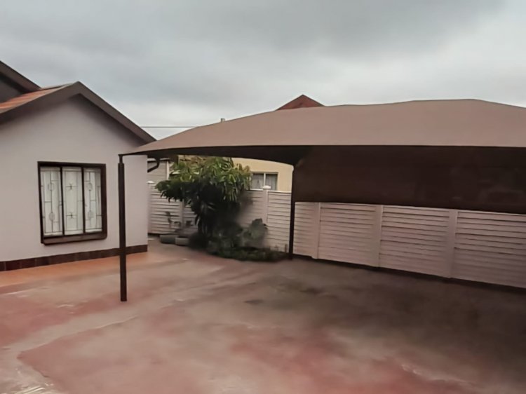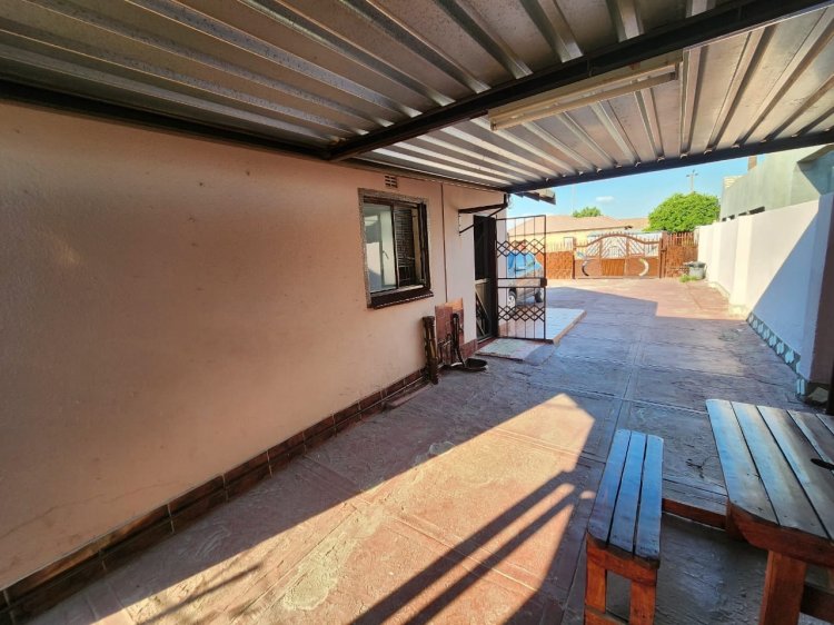 The yard measures 273sqm, with 2 double carports providing covered parking for 4 cars, and open parking for an additional 4 cars. The yard is walled around and paved, adding to the property's curb appeal. Additional features include a wooden storage room and a Jojo tank with a pressure pump.
