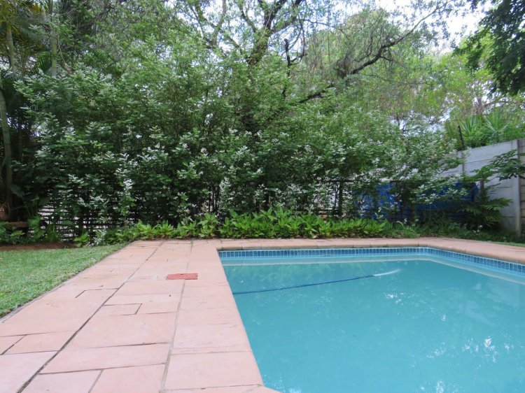 The manicured garden with swimming pool creates an excellent recreational space for the family under shady trees.