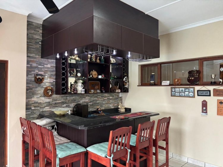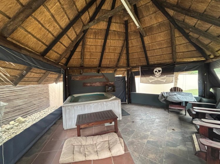 From the patio, access the sparkling pool deck area. Down a few steps and you enter a thatched entertainment haven featuring a Jacuzzi—your private resort at home. A second undercover braai area off the kitchen offers casual seating and relaxed vibes for weekend gatherings.
