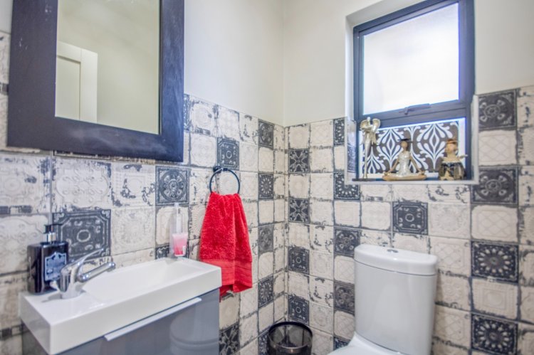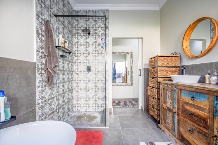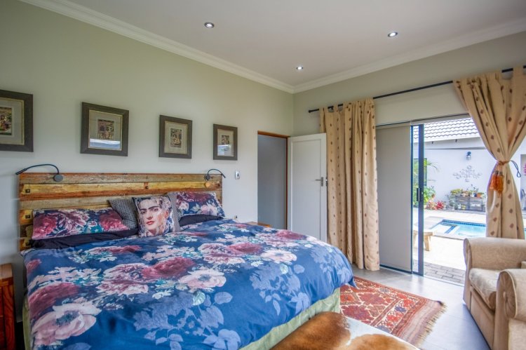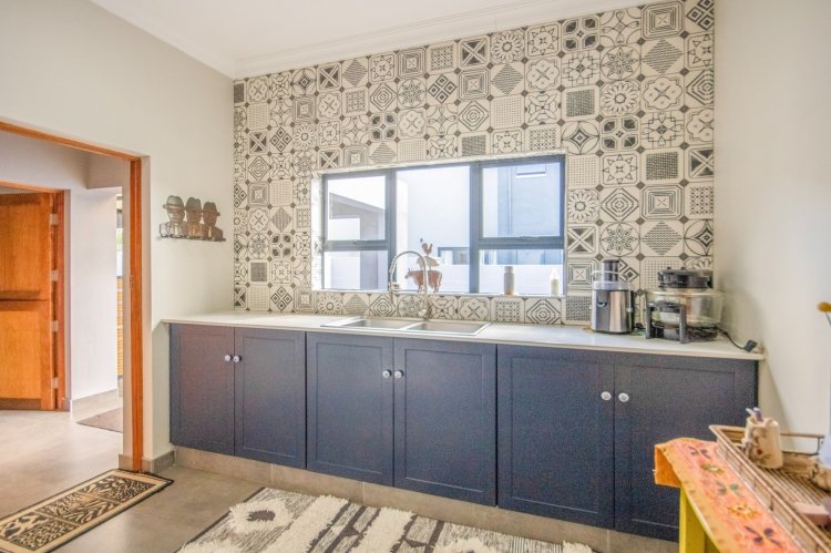 The kitchen features striking blue cabinetry, complemented by a separate scullery and laundry area. Warm, artistic finishes and boho-inspired touches add a distinctive personality throughout, giving the home a stylish yet grounded appeal.