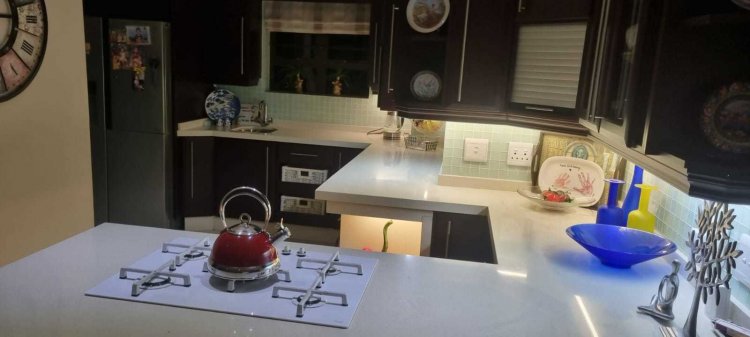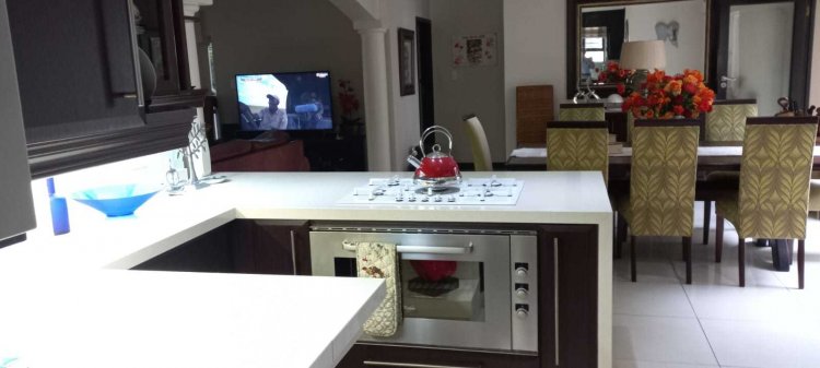 • A gourmet kitchen adorned with Caesar stone counter tops, a gas hob, two under counter ovens with lots of cupboards. A separate scullery and laundry flow off the kitchen.