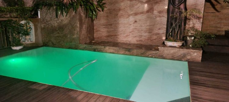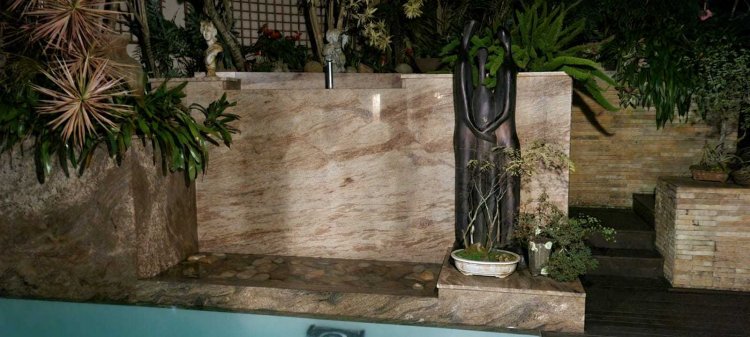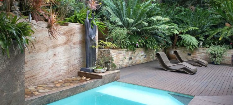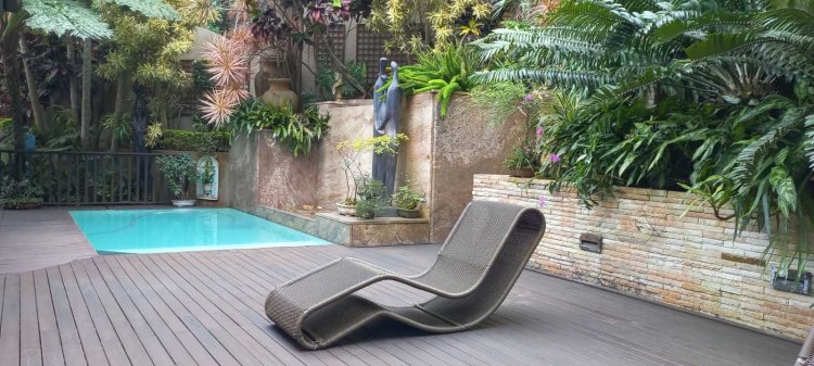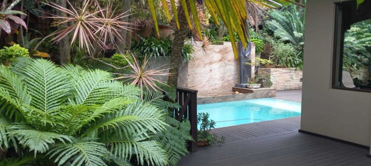 • Relax in the patio surrounded by a tropical paradise including a lit up pool, a wooden deck to expose beautiful tropical plants and a water feature lit up at night