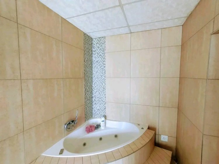 The large kitchen comes equipped with built-in cupboards, providing ample storage and workspace, while the living and TV rooms offer ideal spaces for family gatherings and relaxation. Additional features include a garage, prepaid electricity, and a fully functional geyser.