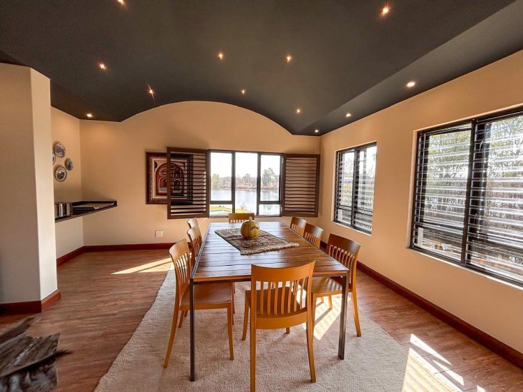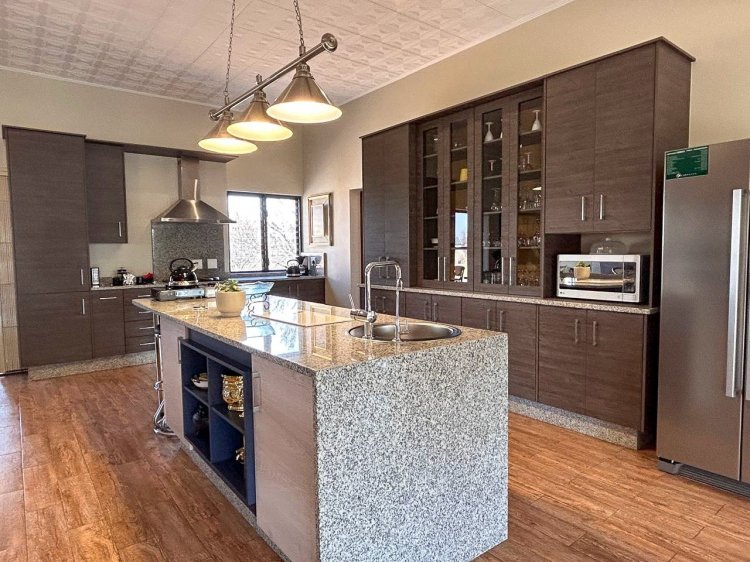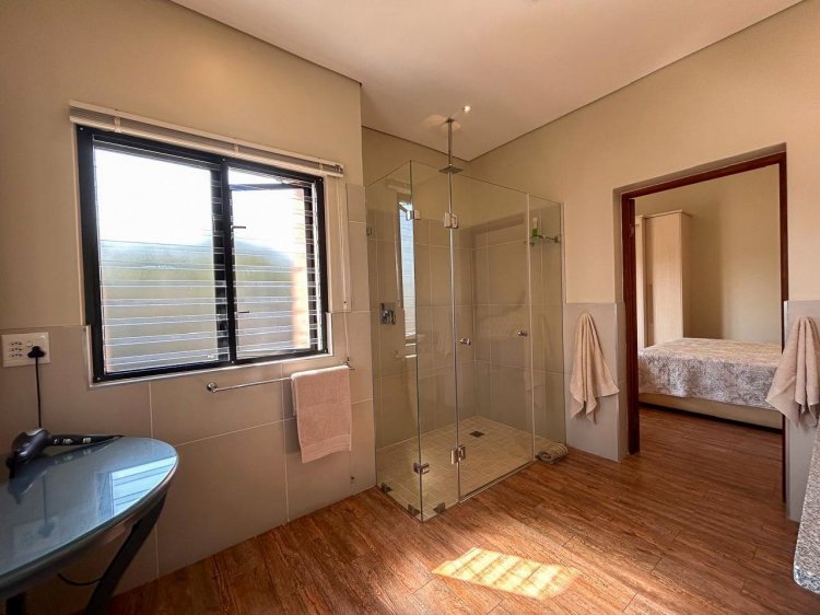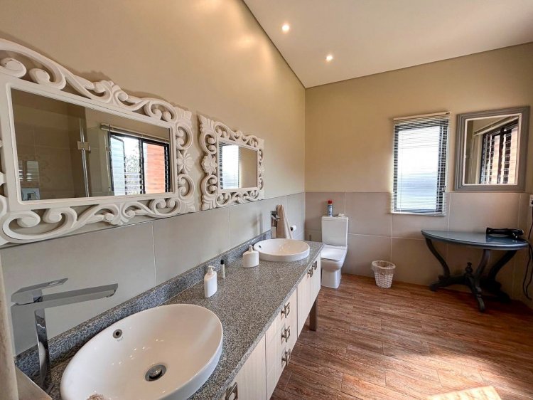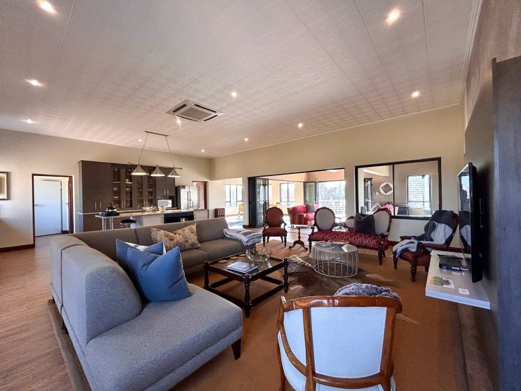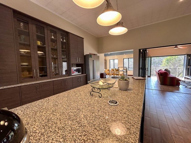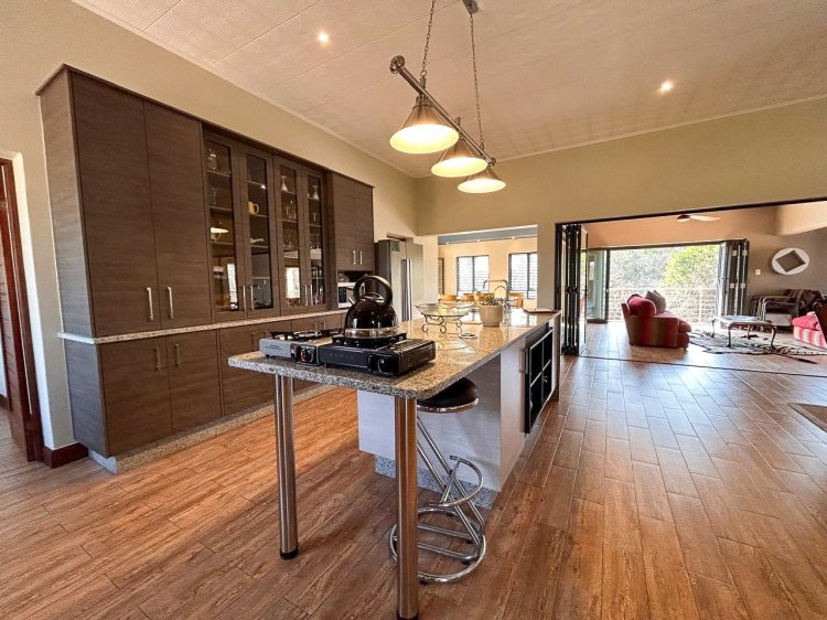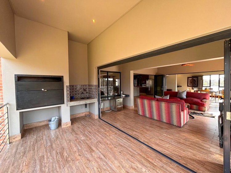Upstairs, an expansive open plan living and dining area unfolds effortlessly, offering the perfect space for both family gatherings and entertaining. At the heart of this space is a sleek, modern kitchen complete with a central island – the ideal place to prepare meals while still being part of the conversation. For the gourmet enthusiast, the home also offers a temperature-controlled cold room, ideal for keeping fresh produce, fine wines, or bulk supplies perfectly stored and separate scullery. Large windows flood the living area with natural light, while sliding doors open to a covered stoep with a built-in braai, where you can enjoy relaxed afternoons and uninterrupted river views just a few meters away.