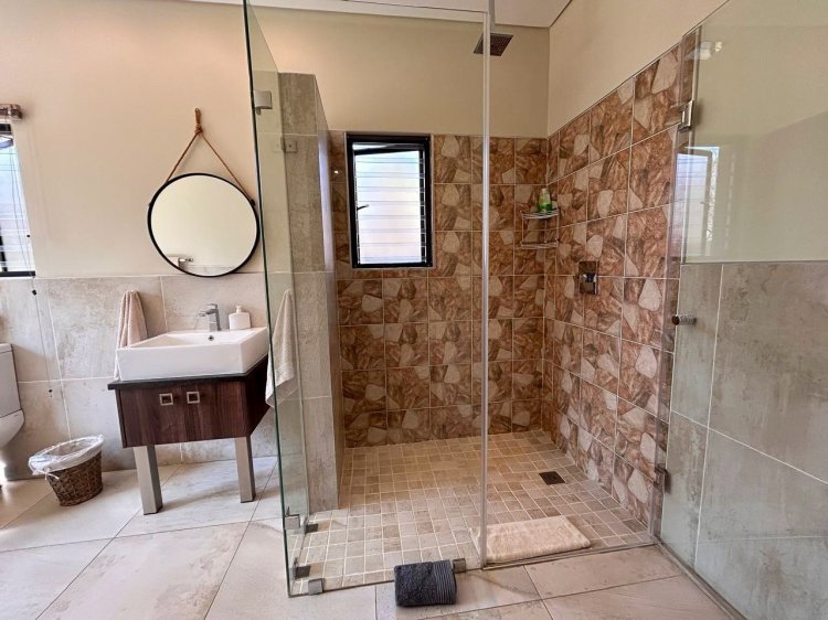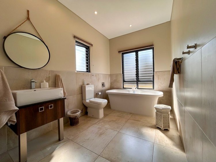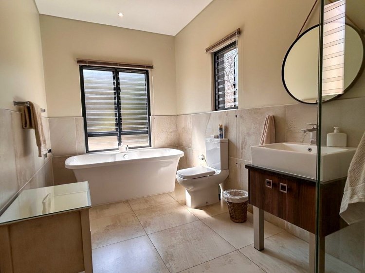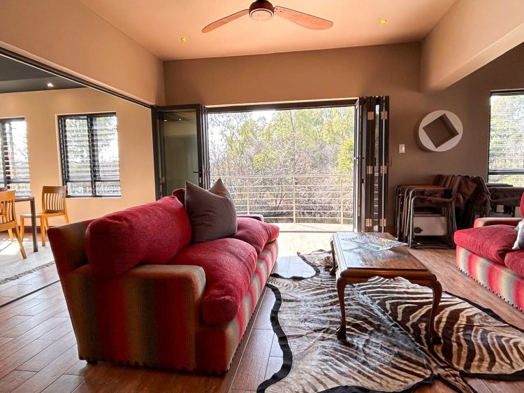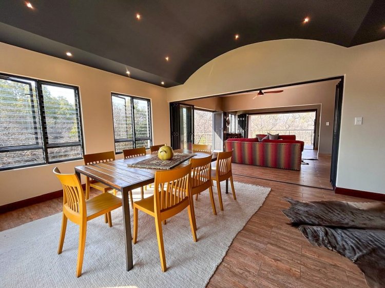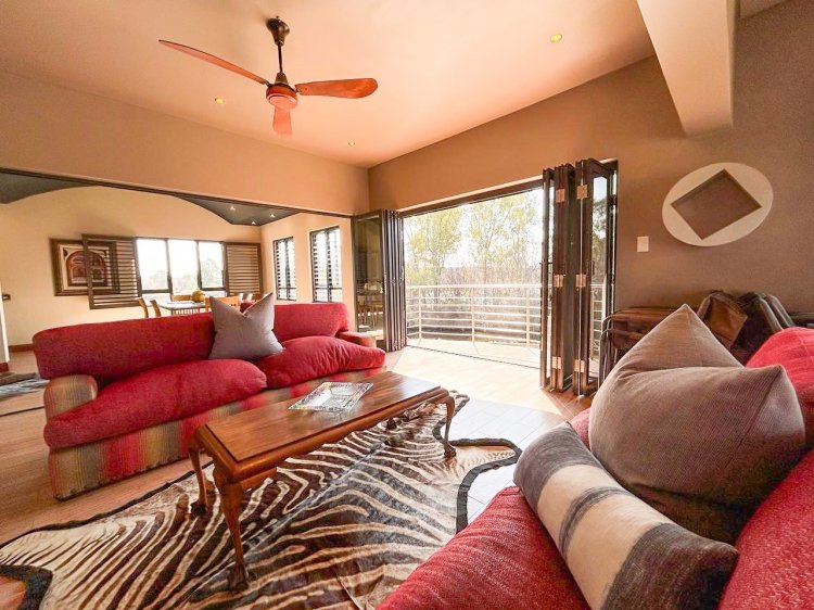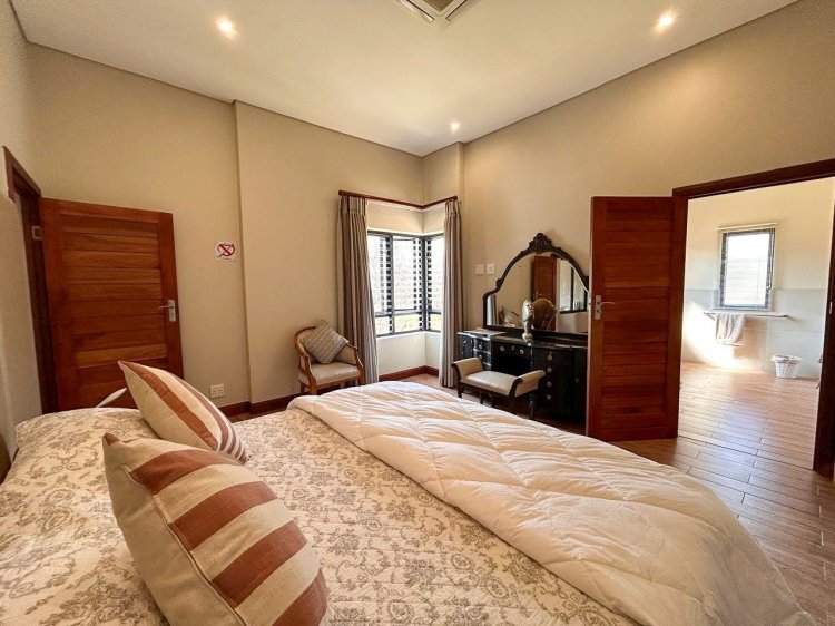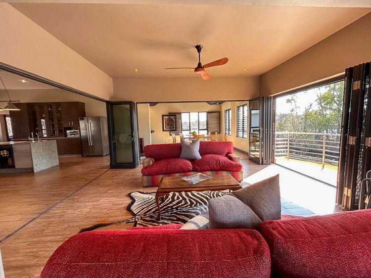 Upstairs, an expansive open plan living and dining area unfolds effortlessly, offering the perfect space for both family gatherings and entertaining. At the heart of this space is a sleek, modern kitchen complete with a central island – the ideal place to prepare meals while still being part of the conversation. For the gourmet enthusiast, the home also offers a temperature-controlled cold room, ideal for keeping fresh produce, fine wines, or bulk supplies perfectly stored and separate scullery. Large windows flood the living area with natural light, while sliding doors open to a covered stoep with a built-in braai, where you can enjoy relaxed afternoons and uninterrupted river views just a few meters away.