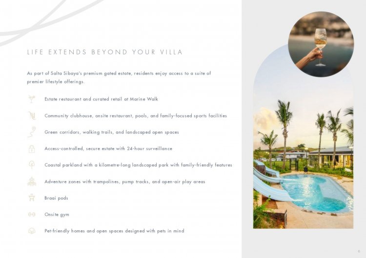 Salta Sibaya Estate Lifestyle Estate restaurant & retail at Marine Walk Community clubhouse with restaurant Swimming pools and family sports facilities Landscaped green corridors & walking trails Kilometre-long coastal park Adventure zones, pump tracks & play areas Braai pods & communal gathering spaces Onsite gym Pet-friendly estate Access-controlled security with 24-hour surveillance