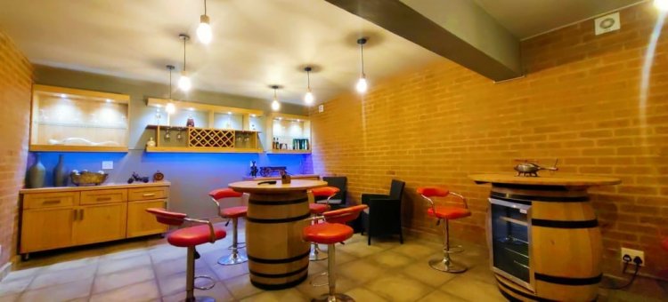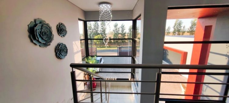 The ground level consists of a striking entrance hall, spacious open plan living areas and tons of natural light stepping out onto a patio with breathtaking views over a bass dam. A designer Caesarstone kitchen outfitted with high-end SMEG appliances, spacious pantry, scullery and convenient laundry room. Private quest suite/flat that consists of a cozy living area, bedroom and a bathroom with its own entrance with access to the patio and dam. Enjoy a wine cellar and the braai area with sliding doors out to a patio overlooking the swimming pool, boma and dam.