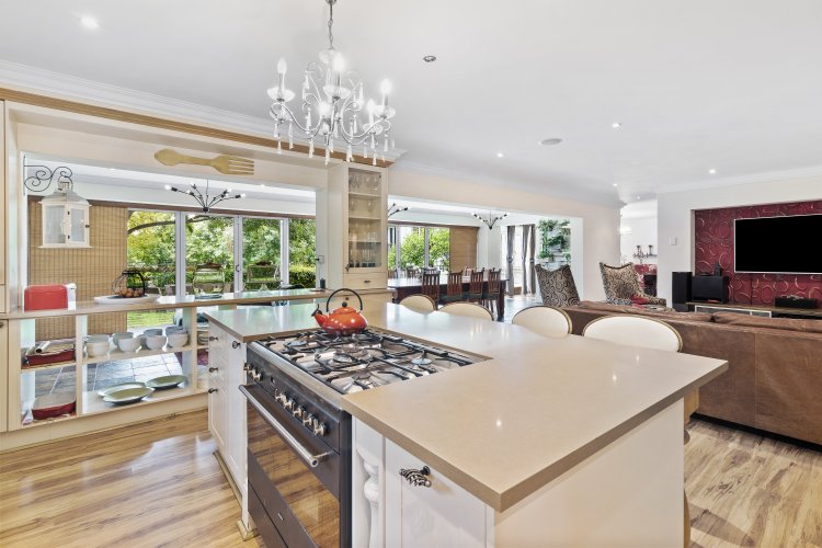 Family Living, Kitchen & Informal Spaces: The heart of the home is a well-appointed kitchen fitted with premium Smeg appliances, complemented by a casual dining area and an inviting family lounge with a cosy fireplace. These spaces open onto an expansive covered veranda overlooking the sparkling pool and tranquil shaded garden. Outdoor features include a coal-heated hot tub, fire pit, and charming gazebo, all perfect for relaxed family living and entertaining.
