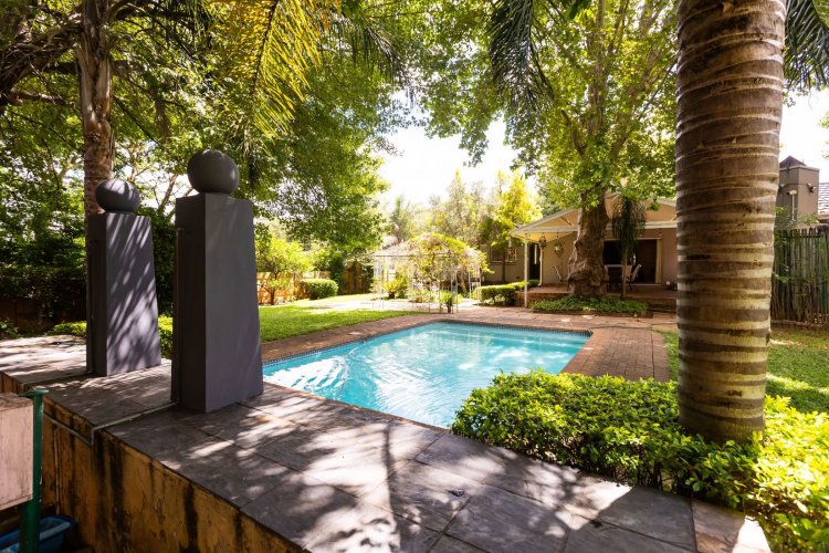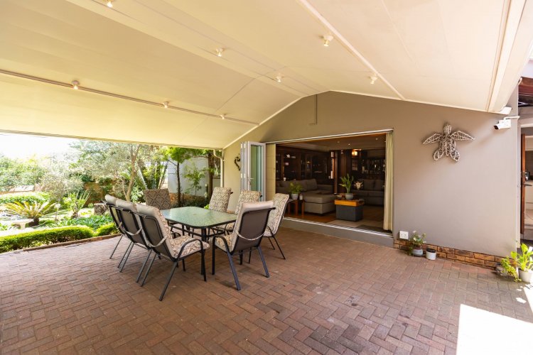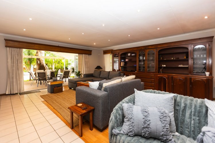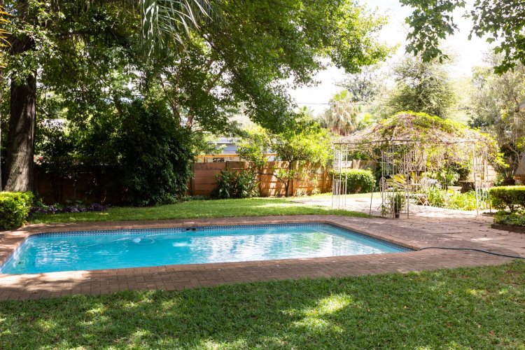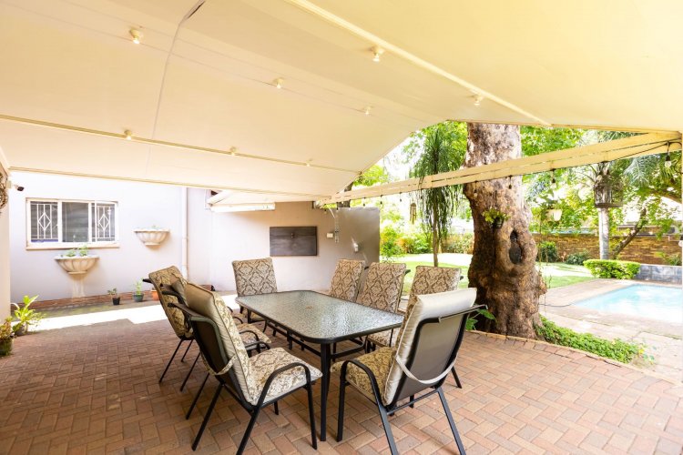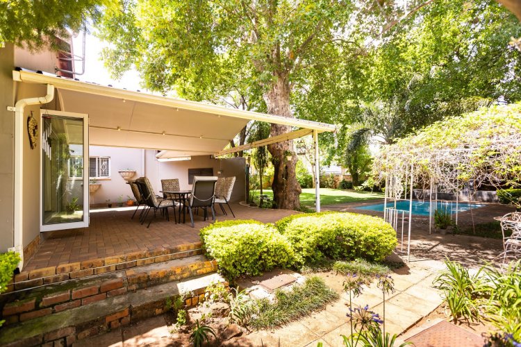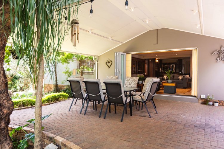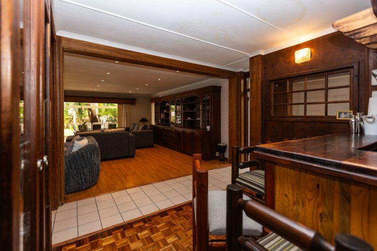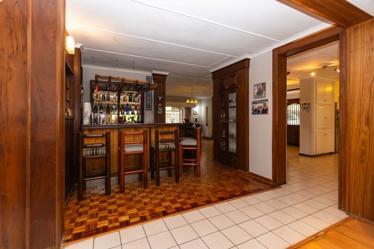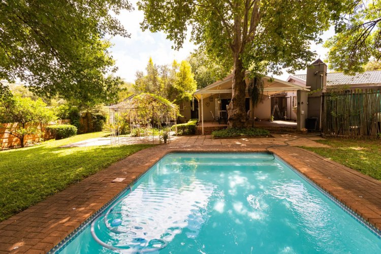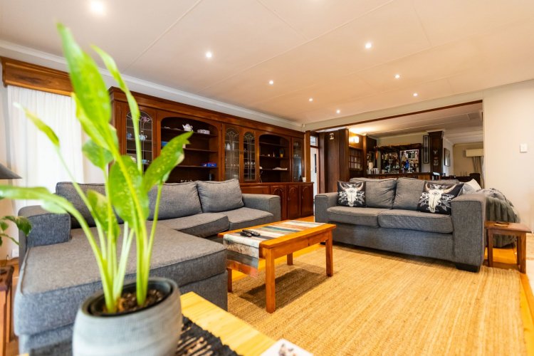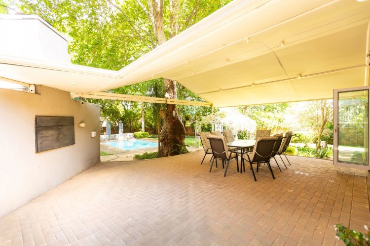 Follow an interesting journey through the charming dining room with immaculate parque flooring and fireplace towards the enormous living area. This space is for the entertainer! A magnificent built in unit stands as a feature, grounding the space which also boasts a wood burning fireplace, a built in bar and stacking doors to a large undercover patio with a built in braai. The stacking doors, when open, allows the outside to blend with the interior. Both the living area and patio have a gorgeous view of the back garden with a heated swimming pool and lush vegetation, perfectly private and tranquil. This can be further enjoyed from the garden pergola, the perfect spot for summer dinners.