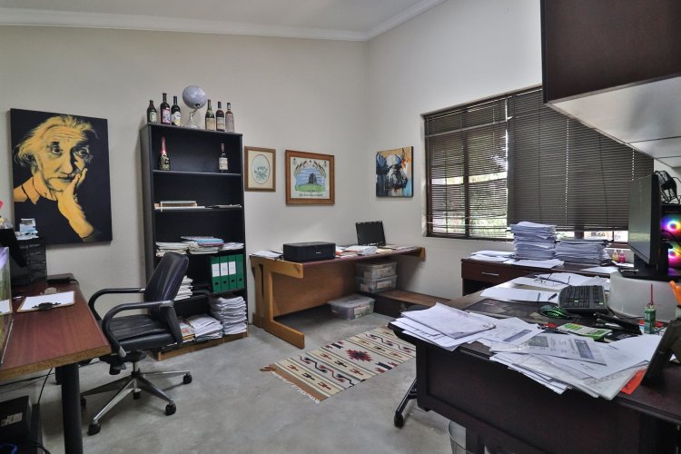 As you step into the welcoming hallway, you'll find a generous open-plan kitchen, lounge, and dining space. On the other side, a sizable office or flatlet (comprising three rooms) with a separate entrance provides added convenience and flexibility. The inviting lounge, highlighted by soaring ceilings and a cozy fireplace, seamlessly transitions to a large covered entertainment area, complete with a built-in braai, boma, and swimming pool, all surrounded by a serene private oasis.