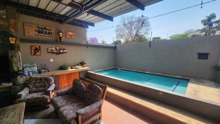 Step outside to discover an entertainer’s dream — a sparkling swimming pool, a covered entertainment area perfect for braais and outdoor relaxation, and a lovely garden ideal for children and pets. A JoJo tank ensures water availability, adding convenience and peace of mind.