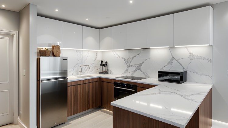• Experience a cozy yet comfortable living space featuring stylish Caesarstone countertops, an electric hob, an under-counter oven, and built-in cupboards.