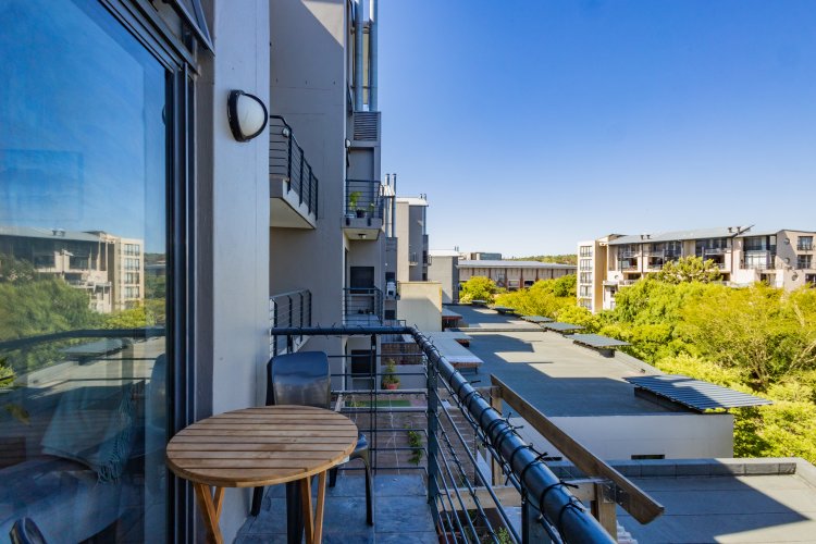 As you enter the apartment, you are greeted by a modern kitchen with granite countertops and spacious living space. The sliding doors open onto a balcony with a built-in wood braai, overlooking the luscious greenbelt.