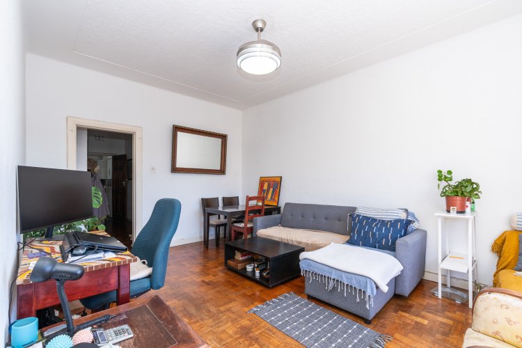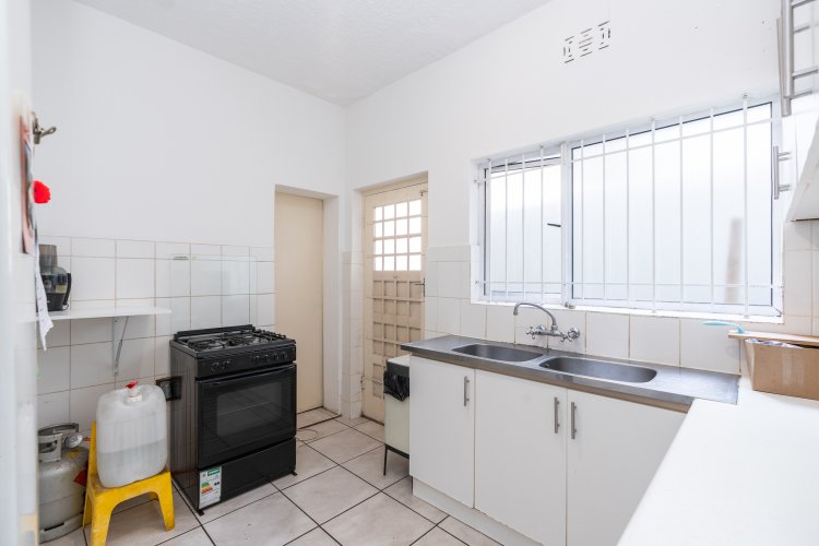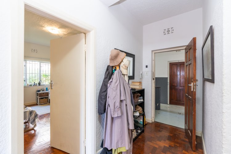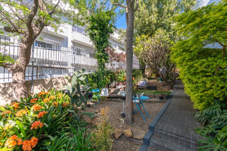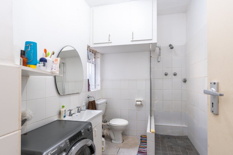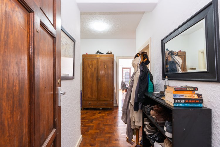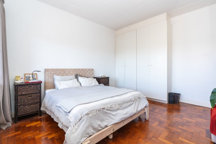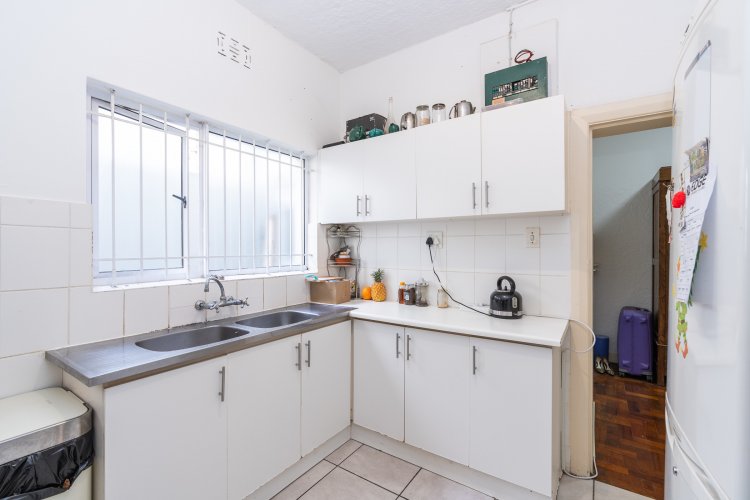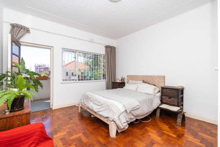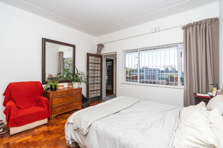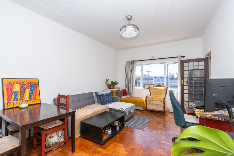 North facing, lower floor corner spacious apartment with balcony. Entrance area & large living area opens to balcony. High ceilings & parquet wooden flooring throughout. Spacious main bedroom opens to balcony. Large 2nd bedroom. Bathroom with large shower. Kitchen with ample cupboards. Store room. Opportunity to renovate. Garage with electricity, as well as space to park infront. Small, newly painted Art Deco complex of only 8 units with remote gate entrance. Communal garden & braai area. Cat friendly with Body Corporate Permission.
