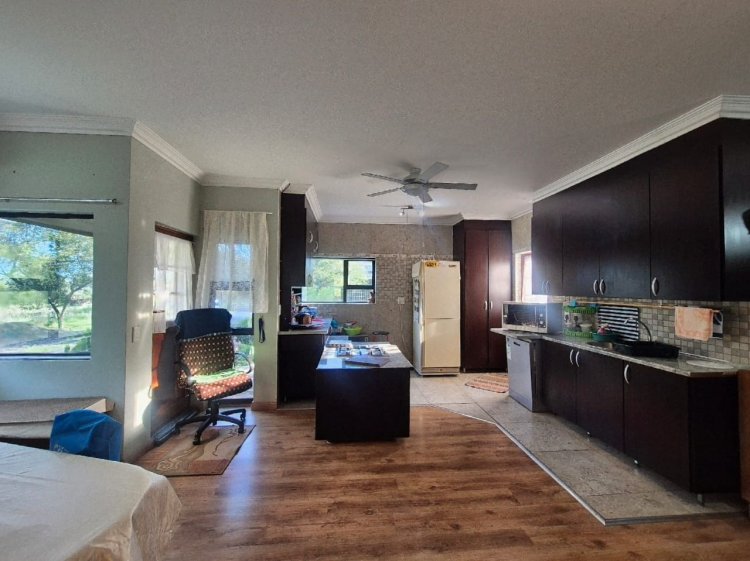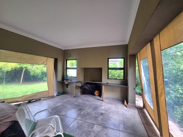 Verder langs die kort gang is ’n groot skuifdeurkas vir ekstra stoorplek, met die gastebadkamer aan die regterkant. Die gastekamer—met ’n deur wat ook na die tuin lei—is direk oorkant die badkamer geleë. Van hier af stap jy in die oopplan kombuis-, eet- en sitkamerarea wat vloei na die lapa. Die lapa, met twee oop kante, bied ’n pragtige uitsig oor ’n rustige park waar wild (verskeie diersoorte) gereeld gesien word en ’n ryk voëllewe teenwoordig is.