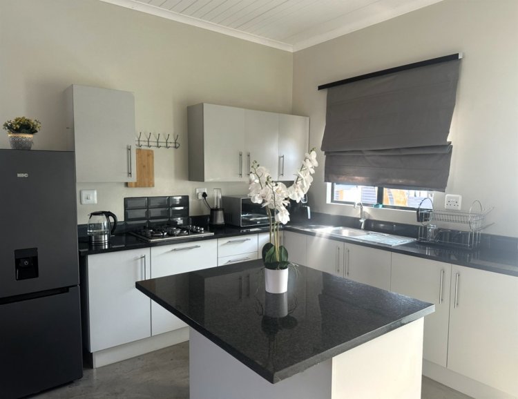 The kitchen is thoughtfully planned with a central island, generous counter space, and designated areas for appliances. A small courtyard with a washing line is accessed from the kitchen.
