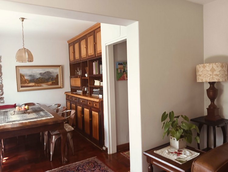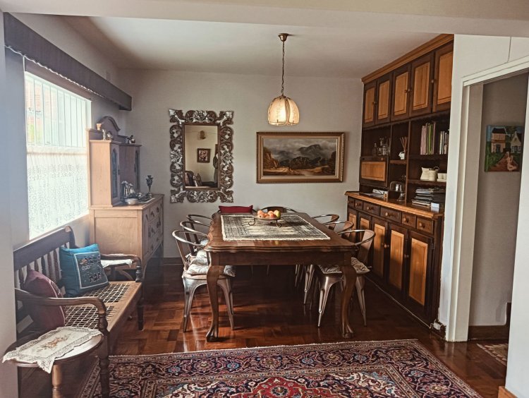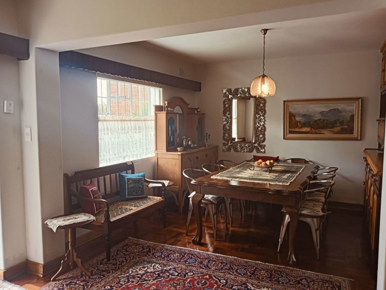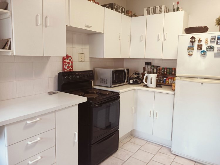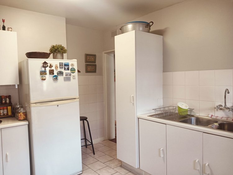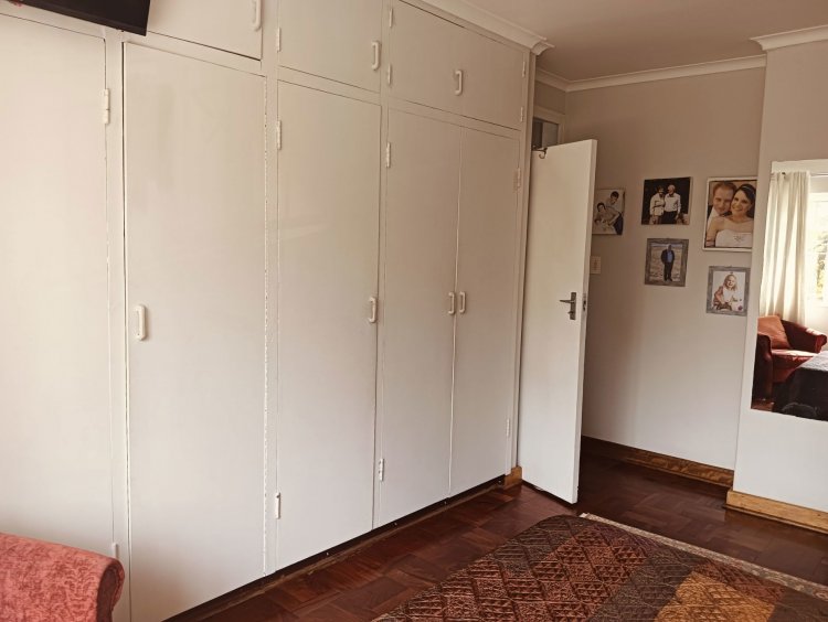 The spacious kitchen is well-designed with ample built-in cupboards.