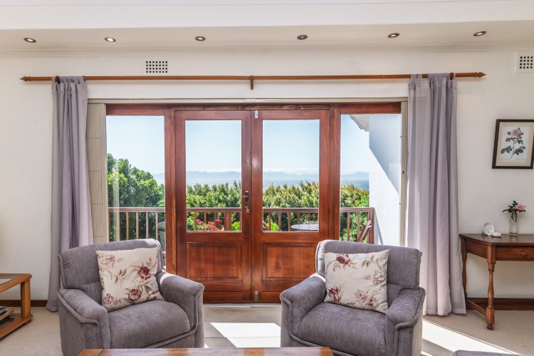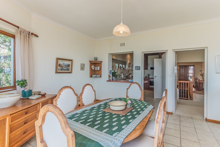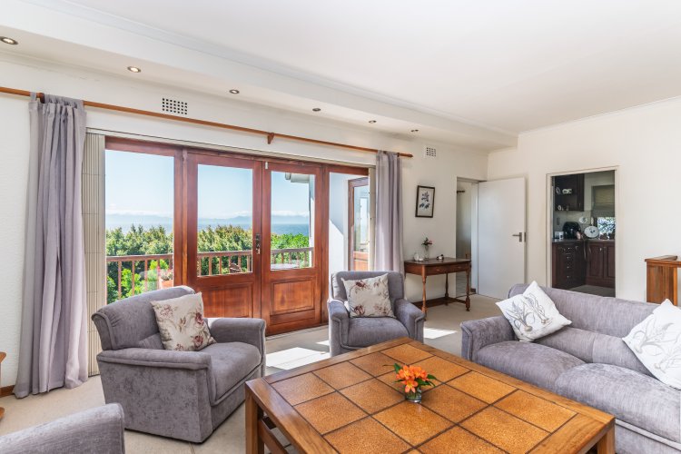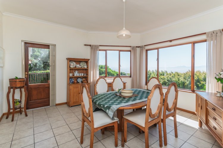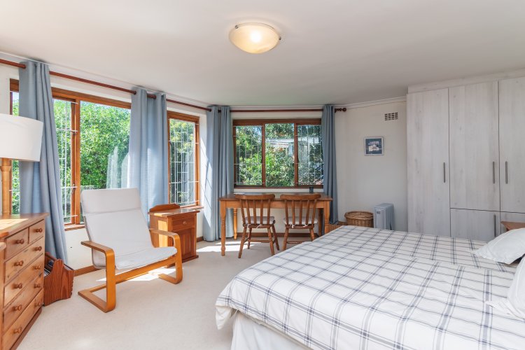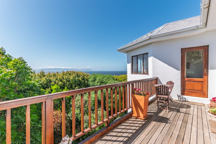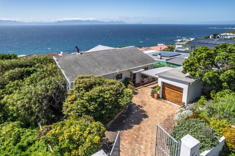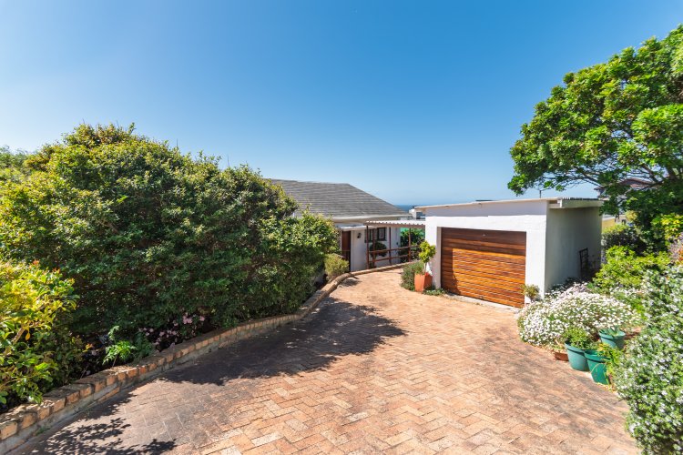 Set in a gorgeous, well-established garden, with sparkling open views across False Bay, you can see passing whales from this 3 bedroom home offering great flow and generous, comfortable accommodation. The top floor is entered from the driveway and comprises a main bedroom, living room (with fireplace) and dining room (easily seating 10) all opening onto the top deck, along with a full bathroom, second bedroom and kitchen. On the lower level you'll find a second living room/den as well as a spacious bedroom and bathroom which is perfect for your guests. Both decks are sheltered from the prevailing winds on the north side and light streams in through the sea facing windows. There is an automated single garage with a carport alongside, and automatic gates to drive in.