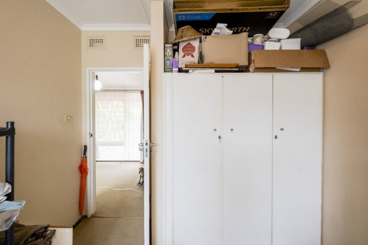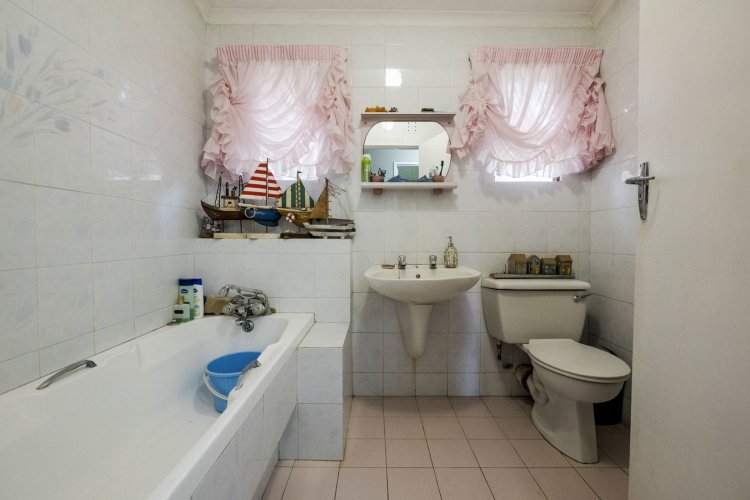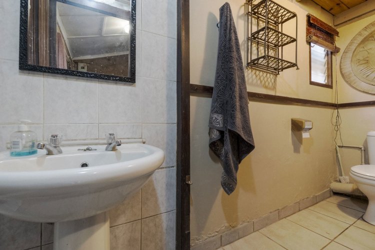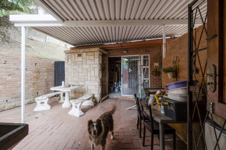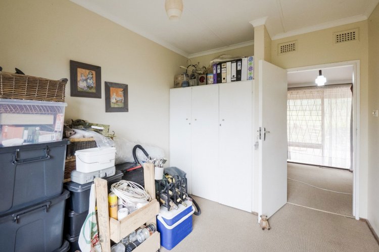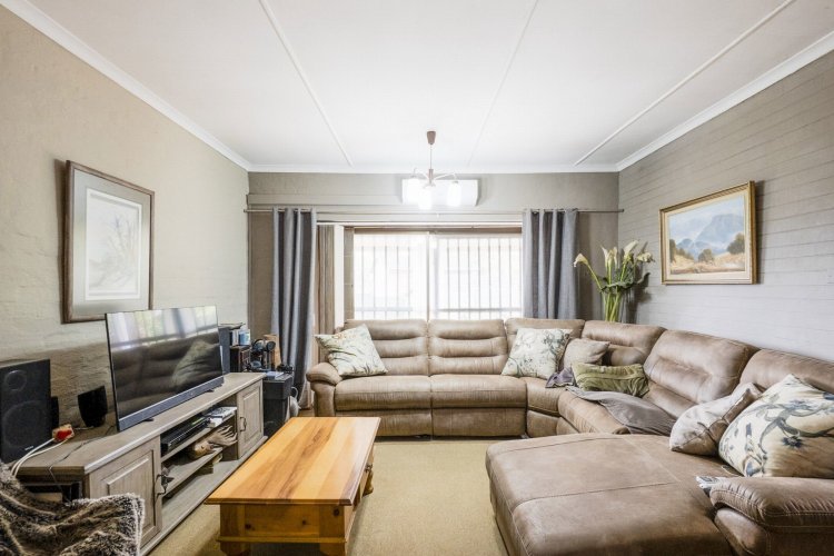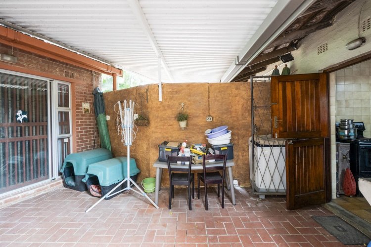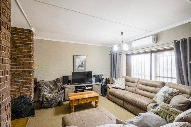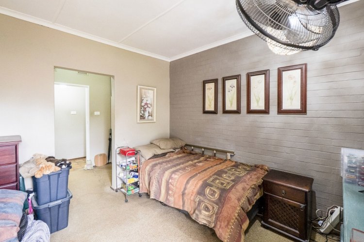 There is one full bathroom (bathtub, basin, toilet) and an additional separate toilet. Two of the bedrooms feature air conditioning units. The property boasts a spacious, well-maintained garden with a garden shed, two JoJo tanks for water storage, and a fully enclosed perimeter. Security is ensured by an automated sliding gate.