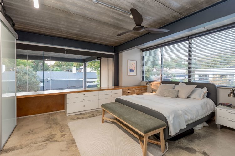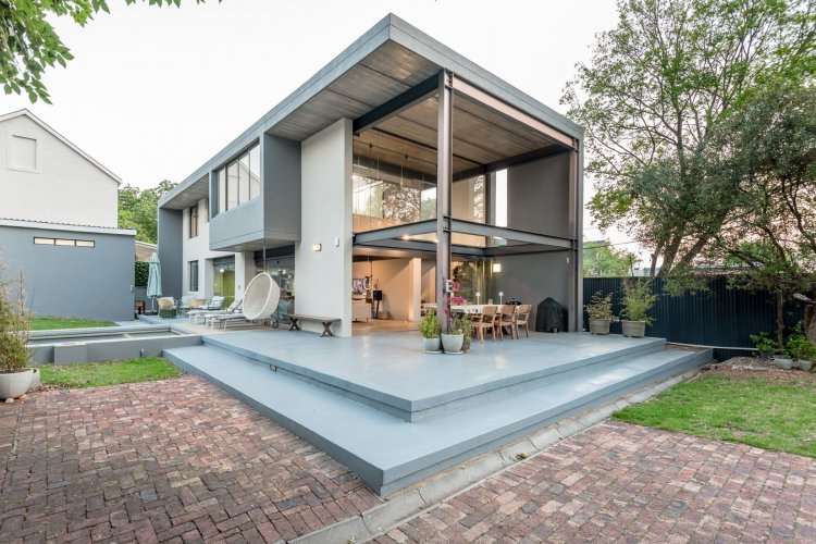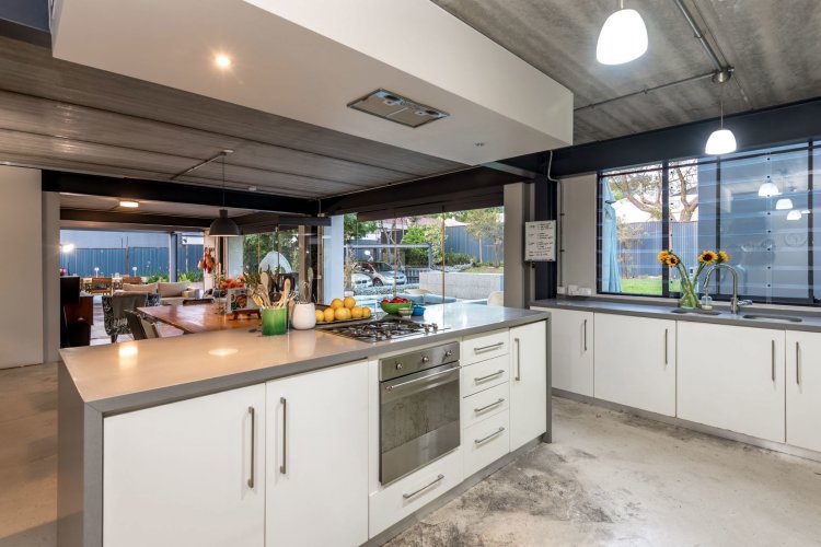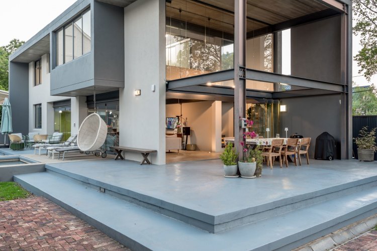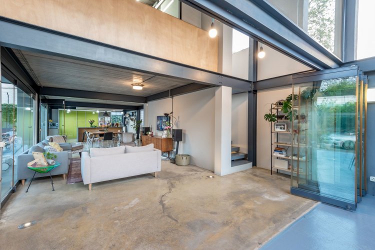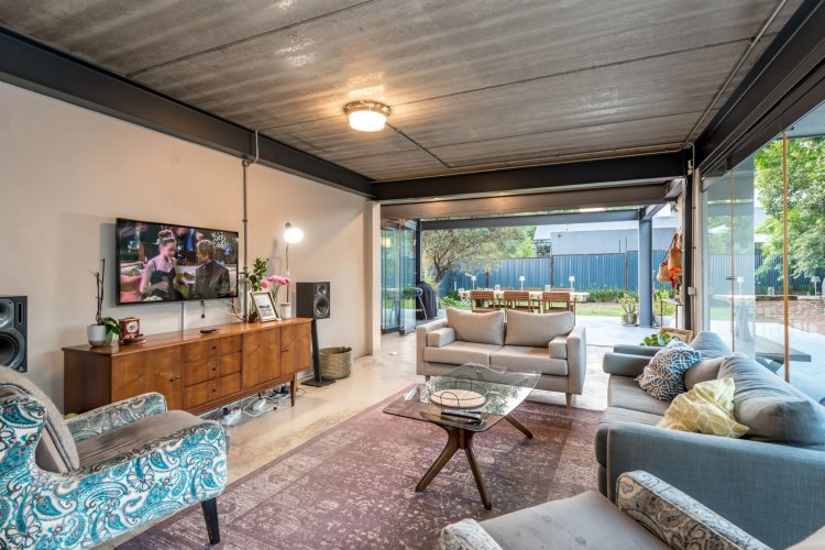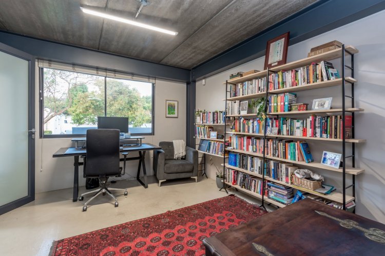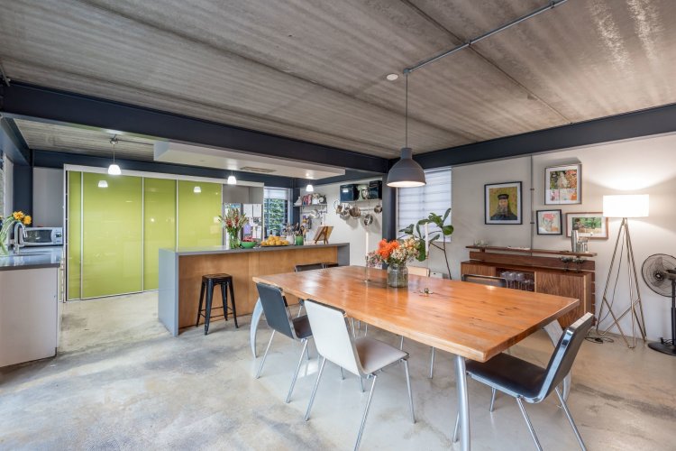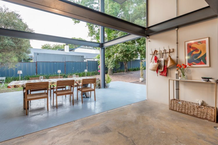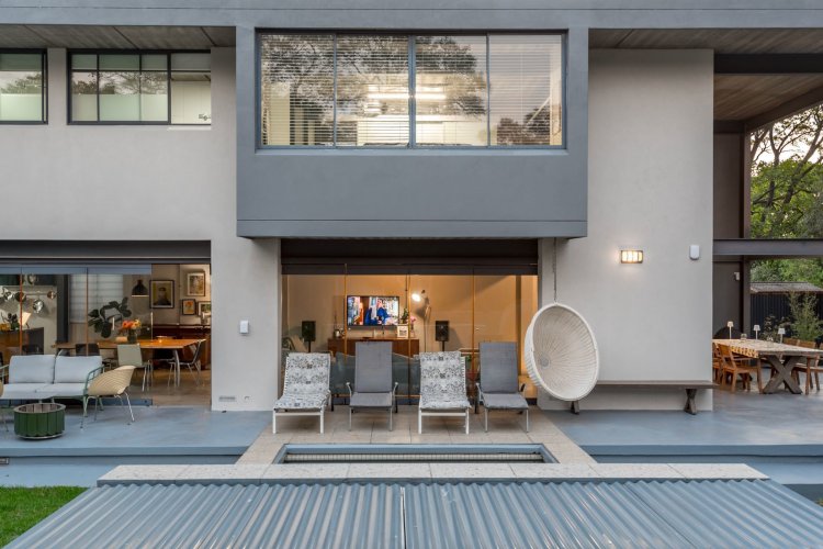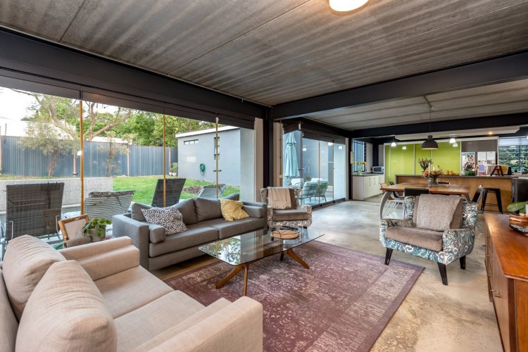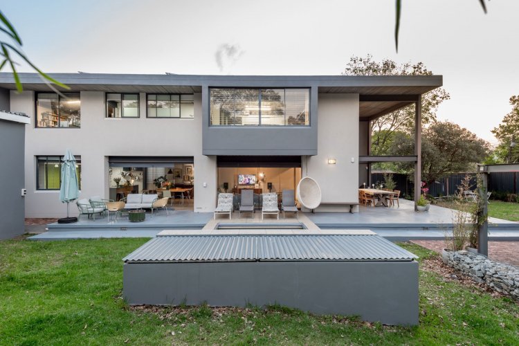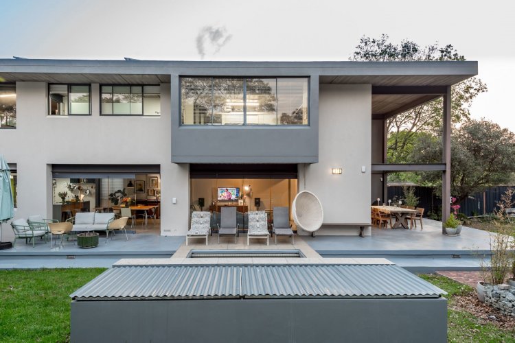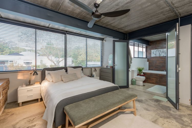 Floor-to-ceiling glass, steel beams and shades of grey. Complete, neat, clean structure. A unique double-storey home set in a quiet, private, panhandle access. Open-plan living and flooded with sunlight. A true statement in style. Private gardens, solar-heated pool, and guest cottage.