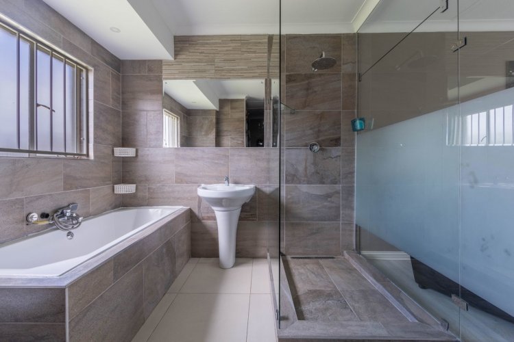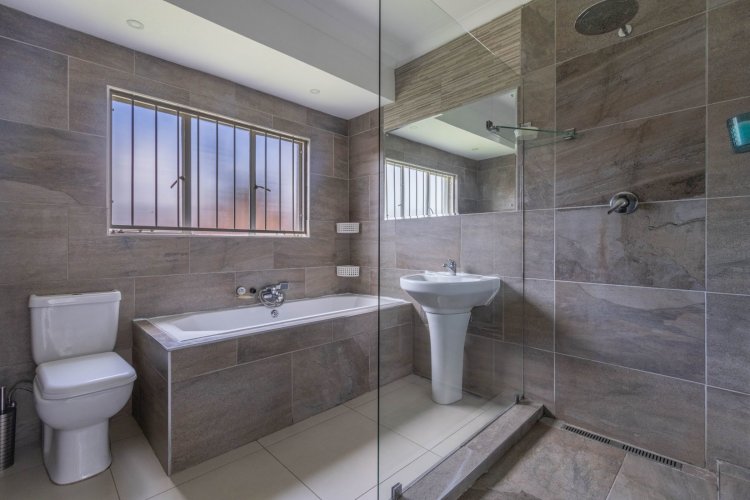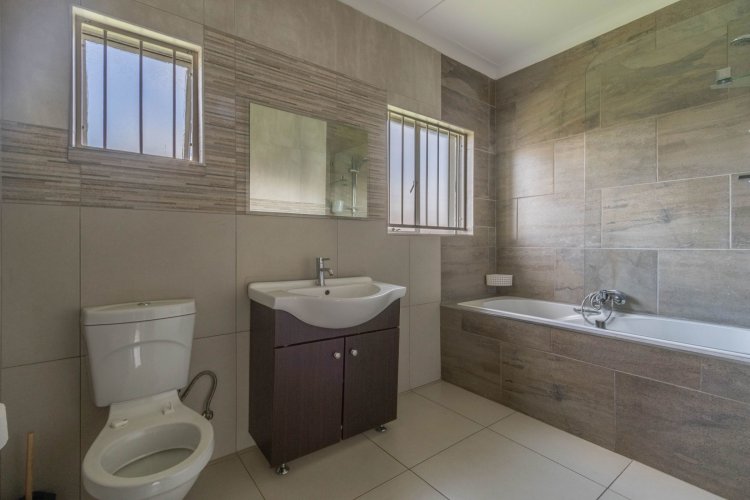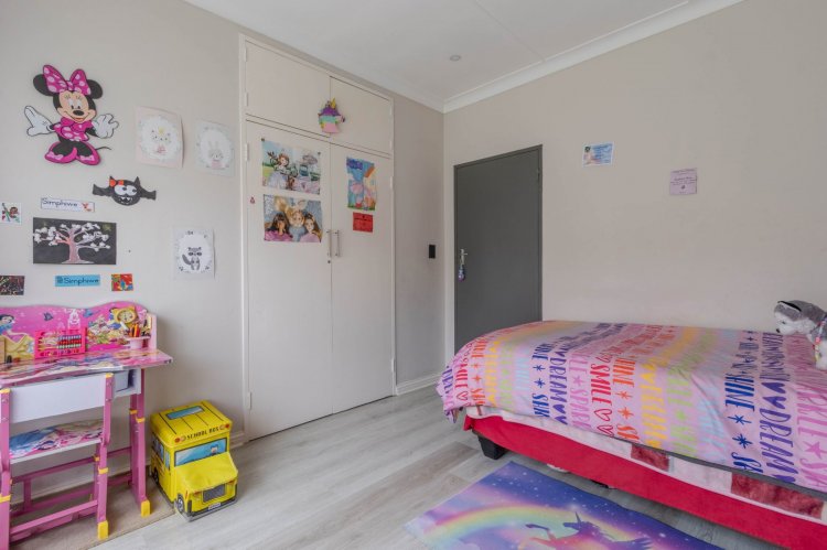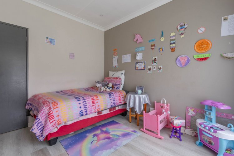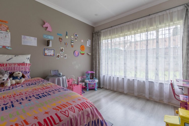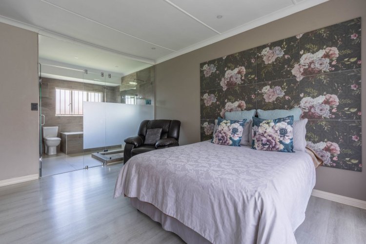 Down the passage are three comfortable bedrooms and two bathrooms. The two children's rooms have laminate flooring and peaceful views of the front garden, and they share a stylish bathroom with a shower-bath combo and single vanity. The main bedroom is a true retreat—spacious, airy, and complete with laminate flooring and an open-concept full ensuite bathroom and walk-in closet.