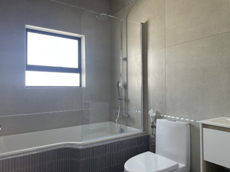 Bedroom 1: Built-in cupboards, vinyl floors, and soft natural light. Bedroom 2: Built-in cupboards, vinyl floors, and a private en-suite with high-end finishes and a bidet toilet. Main Suite: Your own retreat — glass doors open to a paved patio for long summer evenings. The walk-in closet offers a beautiful display and storage shelving, leading to an exquisite main bathroom with a freestanding bath, dual vanities, a spacious shower with adjustable heads, and a toilet with a bidet.