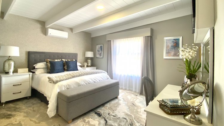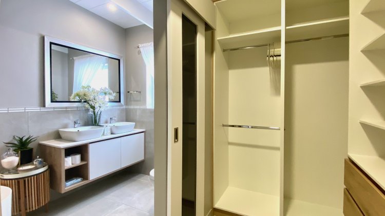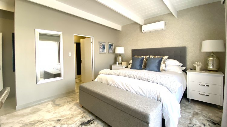 The private main bedroom is a sanctuary with a modern en-suite bathroom and private closet space, providing a perfect retreat after a day on the beach.