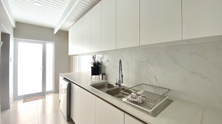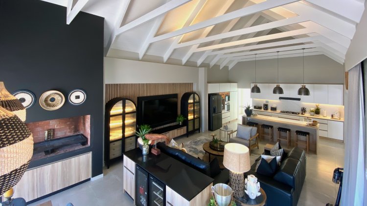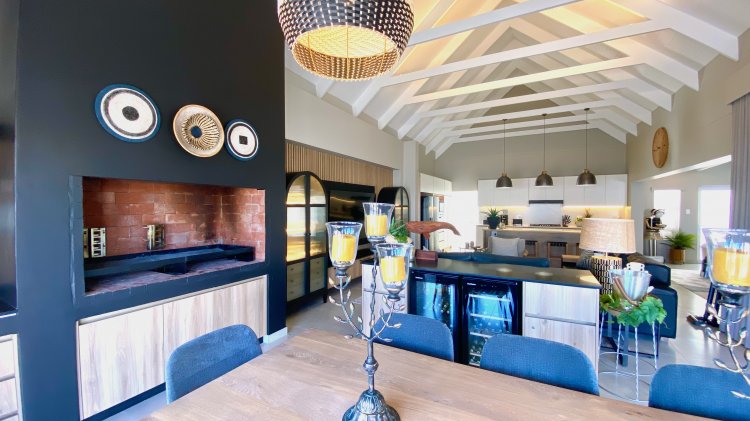 The entertainment area, with an indoor braai, is truly special: The space flows directly onto a fantastic patio. This patio is equipped with a louvered roof and shaded sides, ensuring it remains a comfortable and usable space for dining and relaxation, regardless of the sun or wind.