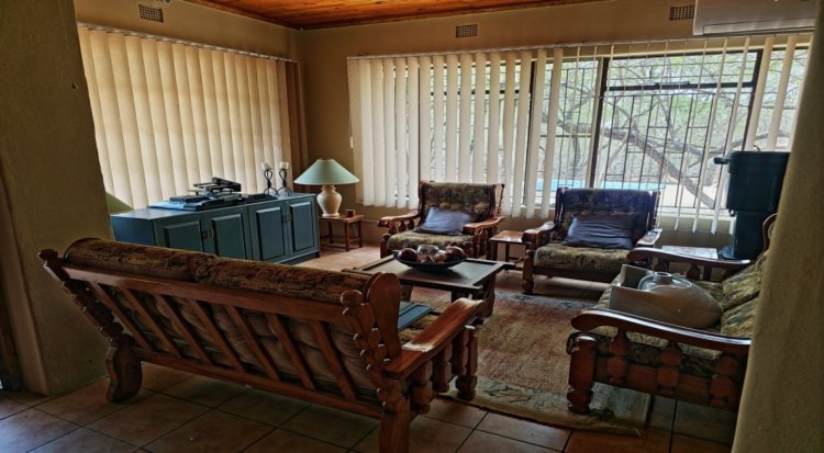 The home features a welcoming open-plan living and dining and kitchen area, and three bedrooms designed for relaxed, easy living. The patio is perfect for outdoor entertaining or simply enjoying the sights and sounds of the bush — where zebra, kudu, and warthog often wander by.